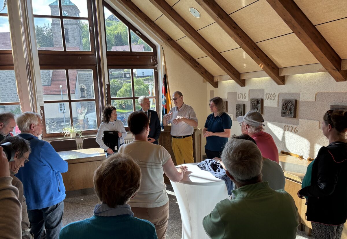 Am Freitagabend fand im Sitzungssaal des Flossenbürger Rathauses ein festlicher, historischer und freundschaftlicher Empfang statt. Gemeinsam mit dem Kulturreferenten der belgischen Partnerstadt Wervik, Masil Steven, hatte Yves Durnez eine Reise für eine Gruppe aus Wervik und Geluweld nach Bayern organisiert. Für Yves Durnez, der wesentlich an der Entstehung der Partnerschaft zwischen Wervik und Flossenbürg beteiligt war und zugleich Mitglied im Kuratorium des Fördervereins KZ Gedenkstätte Flossenbürg ist, war ein Besuch der KZ Gedenkstätte in Flossenbürg eine Herzensangelegenheit.
