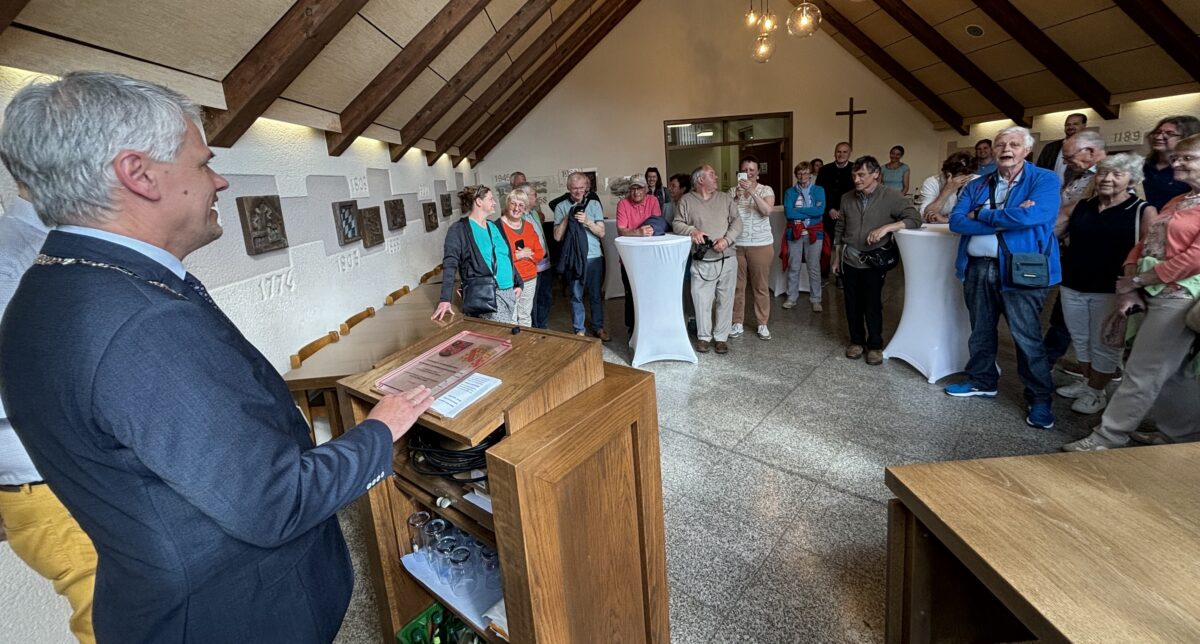 Mit dem Motto der Partnerschaft: „Aus Feinden werden Freunde – am Ende hat die Liebe und nicht der Hass gesiegt!“, wurde ein Zeichen in die Welt gesetzt, so Meiler. Die Zuhörer applaudierten spontan. Den belgischen Gästen erklärte Meiler anhand der Tafeln an den Wänden des Sitzungssaales die wichtigsten Meilensteine in der Entwicklung der Gemeinde von 948 bis heute. Erst letztes Jahr im Rahmen der 1075-Jahrfeier der Gemeinde wurden vier weitere Tafeln hinzugefügt.