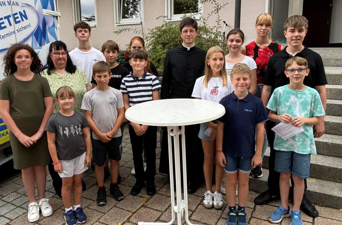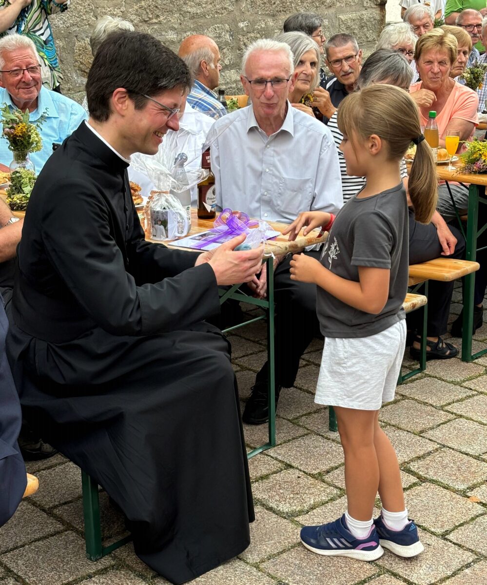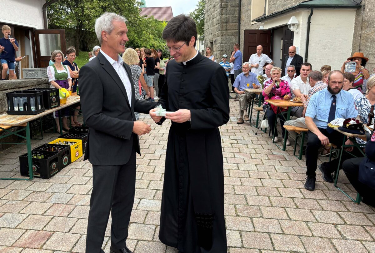 Die Ministranten brachten kleine Gedichte vor, die sie unter der Leitung der Gemeindereferentin Kerstin Wallmeier vorbereitet hatten, und überreichten symbolische Geschenke. Pater Dariusz dankte Pfarrer Gierl mit einer Stola von Maria der Bewahrerin als Andenken. Der Erste Bürgermeister Thomas Meiler lobte die gute Zusammenarbeit bei Bauprojekten und überreichte eine Armbanduhr. Auch Alexander Guro von der Theatergruppe Theresienstadl dankte für die Unterstützung und Zusammenarbeit.