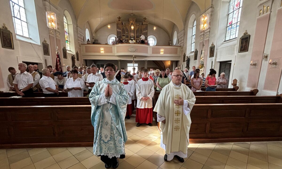 In Flossenbürg kam die katholische Gemeinde am Fest Maria Himmelfahrt zusammen, um den letzten Gottesdienst von Pfarrer Georg Gierl zu feiern. Die Messe, bei der Pater Dariusz Sztuk als Urlaubsvertretung mitgewirkt hat, war nicht nur für die Gemeindemitglieder ein besonderes Ereignis, sondern auch für die örtlichen Vereine, die mit ihren Fahnenabordnungen teilnahmen. In seiner Predigt unterstrich Pfarrer Gierl die Bedeutung von Mariä Himmelfahrt, indem er sagte: „Durch die Hoffnung auf neuen Anfang werden Abschiede verkraftbar.” Er zitierte dabei Hermann Hesse: „Jedem Anfang wohnt ein Zauber inne“, um die Bedeutung von Neuanfängen zu unterstreichen.