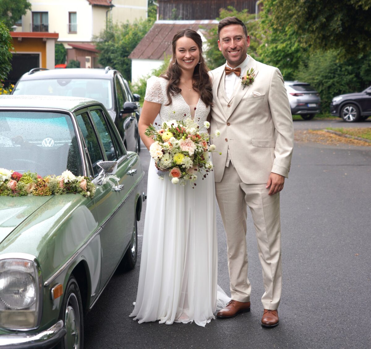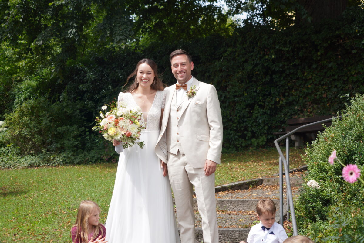 Die musikalische Gestaltung der Trauung übernahm der Waldthurner Chor “amicanti” unter der Leitung von Manuela Grünauer. Begleitet von Annika Pankotsch am E-Piano und Alexandra Jaworski an der Gitarre, verliehen die Sängerinnen und Sänger der Zeremonie eine mitreißende Leichtigkeit. Ein kleiner Schmetterling, der sich in die Kirche verirrte und fröhlich durch das Kirchenschiff flatterte, wurde dabei zum poetischen Sinnbild der Freude. Die Liebe zur Heimat und zueinander sind bei Franziska und Markus tief verwurzelt.