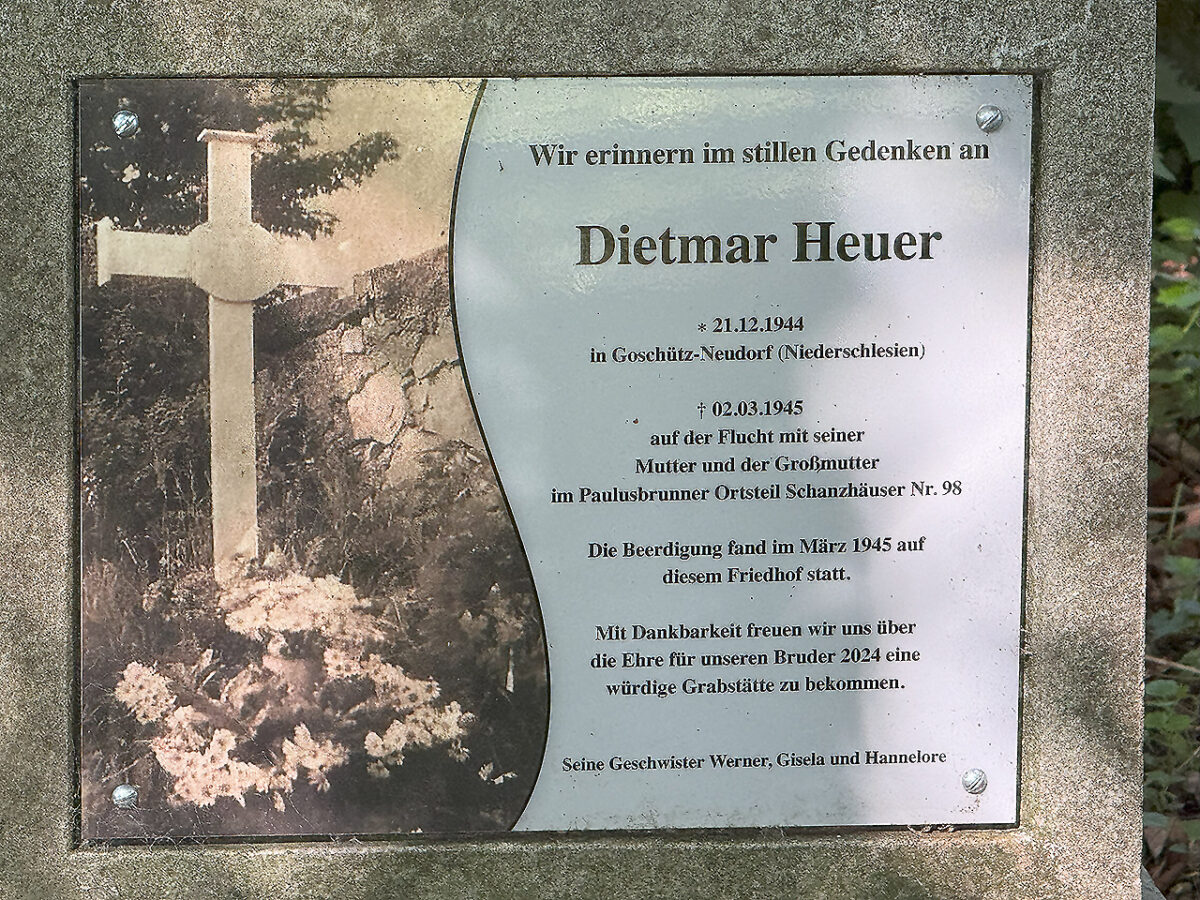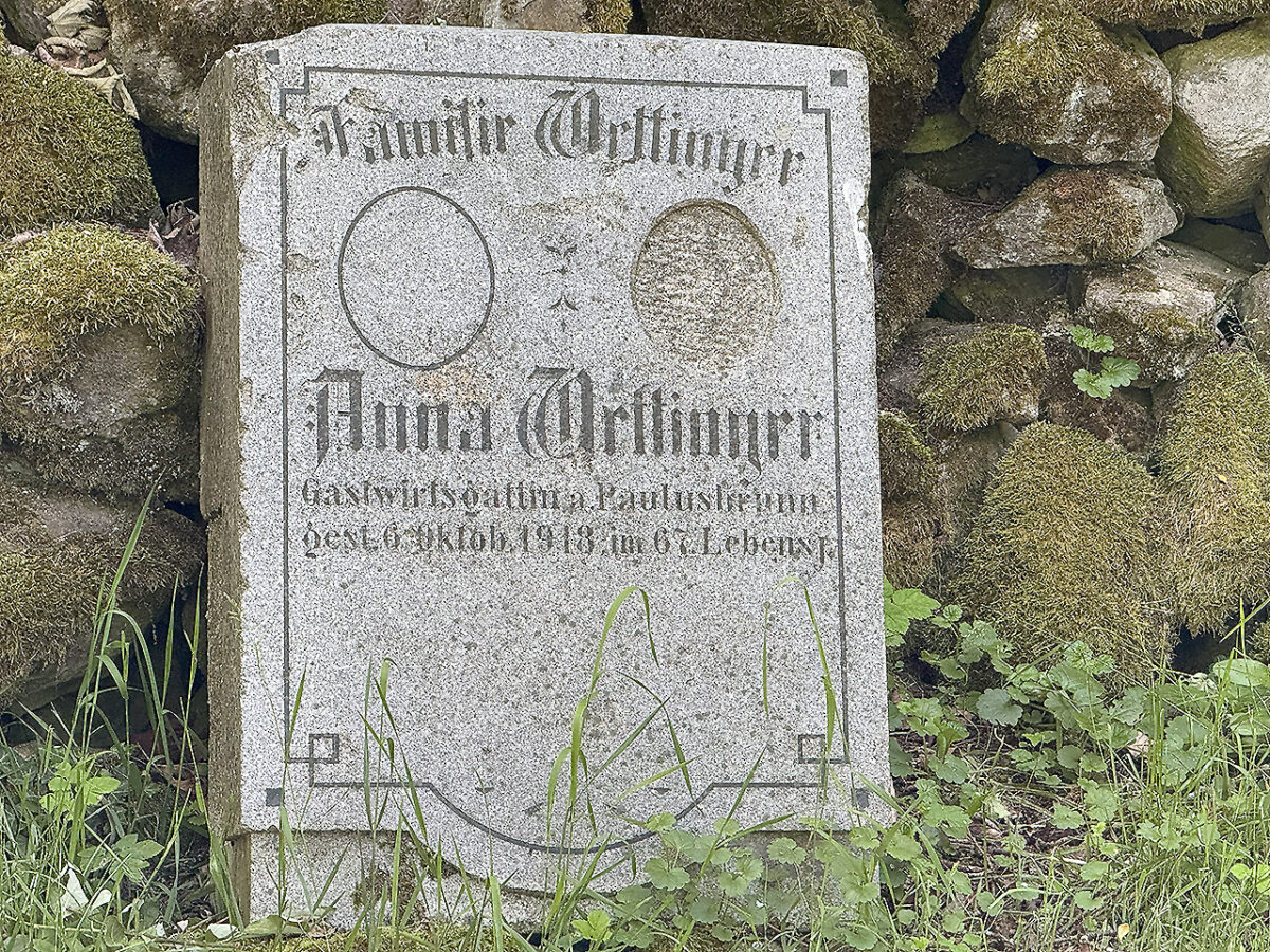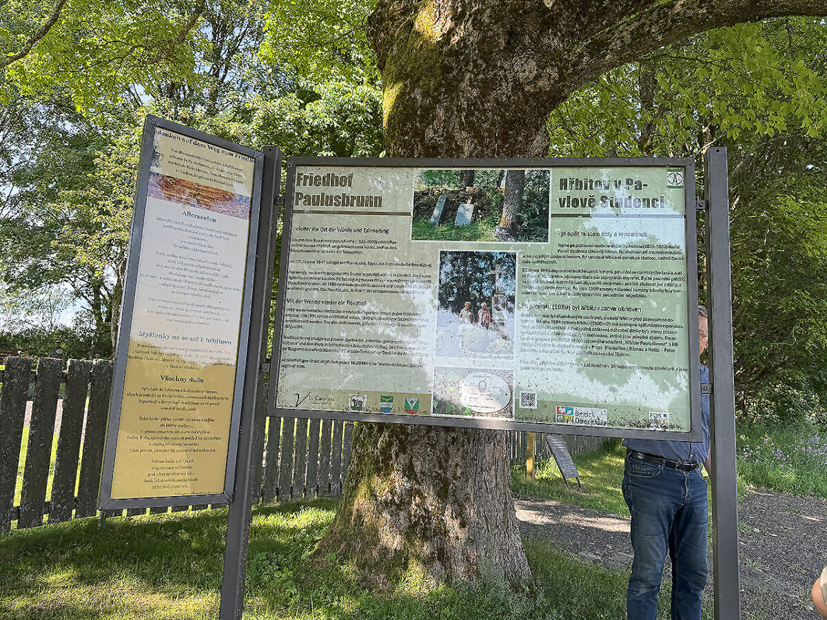 „Der Friedhof auf der anderen Straßenseite wurde nach der Grenzöffnung mithilfe des tschechischen Bürgermeisters František Čurka aus Halže wieder hergestellt“, erklärt Wolf, dessen Großmutter in einem Ortsteil von Paulusbrunn aufwuchs. „Ich selbst habe mit meiner Tochter einen der Grabsteine aus dem Moorgebiet gezogen und hierhergebracht.“ Die Angehörigen der Verstorbenen pflegen die Gedenkstätte unter den großen Lindenbäumen bis heute.
