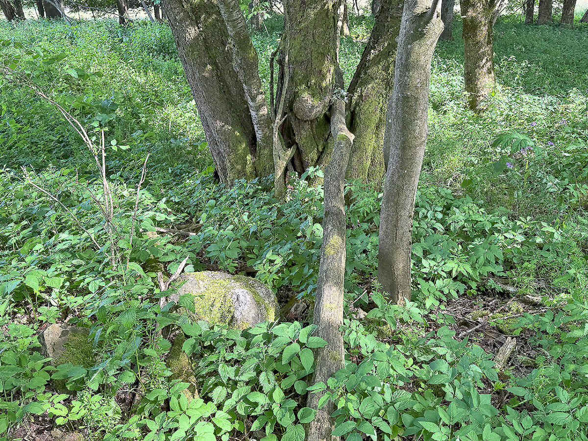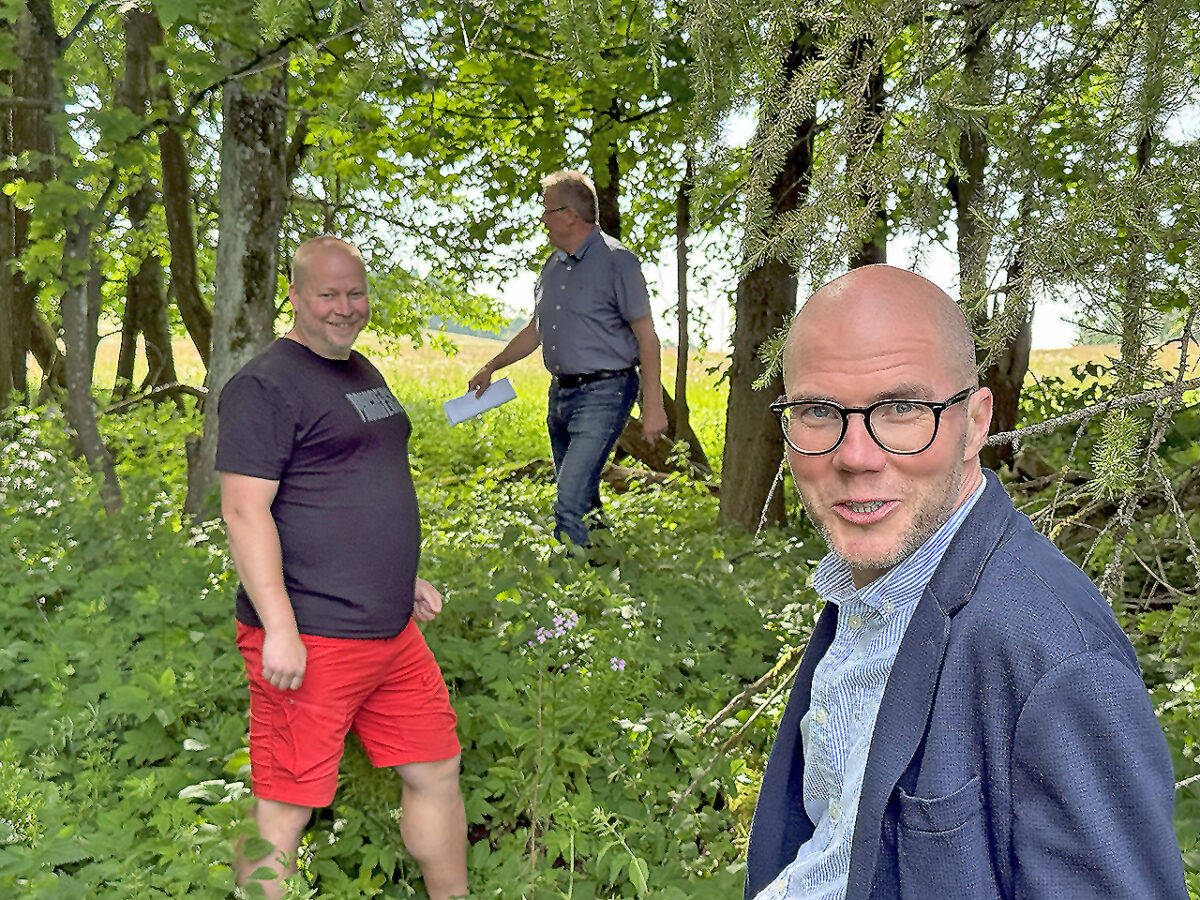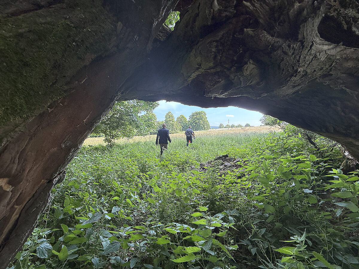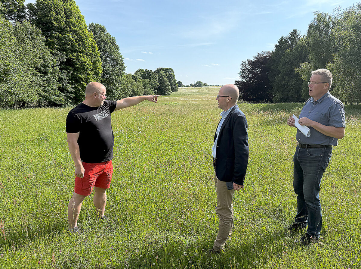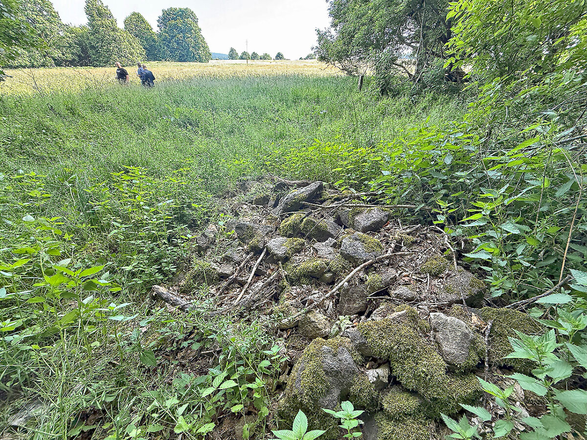 Wo früher eine Kirche, eine Grundschule, Bauernhöfe und Wohnhäuser standen, finden auf einer ausgedehnten Wiese Insekten Nahrung – und die kleine Gruppe mit Alfred Wolf, Matouš Horáček und Václav Vrbík, Geschäftsführer des Geschichtsparks Bärnau, stöbert bei der Geländebegehung vereinzelt Mauerreste, Ziegelsteine und einen Brunnenschacht in den angrenzenden Waldstücken auf.