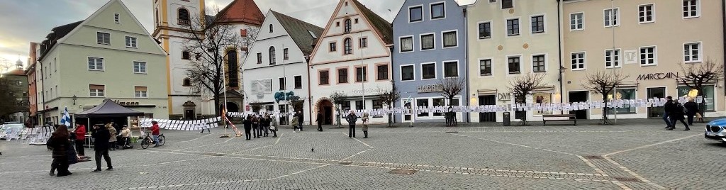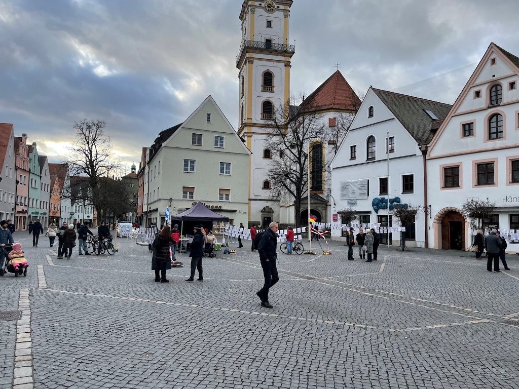 Die Veranstaltung in Weiden am 5. Februar war als “Info-Stand als Sondernutzung” angemeldet, teilt die Stadt auf Nachfrage mit. Der Ausdruck “Infostand” scheint untertrieben, wenn man sich das Ausmaß der Veranstaltung anschaut: ein großer Tisch mit Pavillon, Fahnenmasten mit Deutschland- und Bayernflagge, die etwa 50 Meter lange Bildergalerie, ein “offenes Mikrofon”, in das jeder sprechen konnte. Laut Polizeibericht nahmen an der Veranstaltung etwa 100 Personen teil.