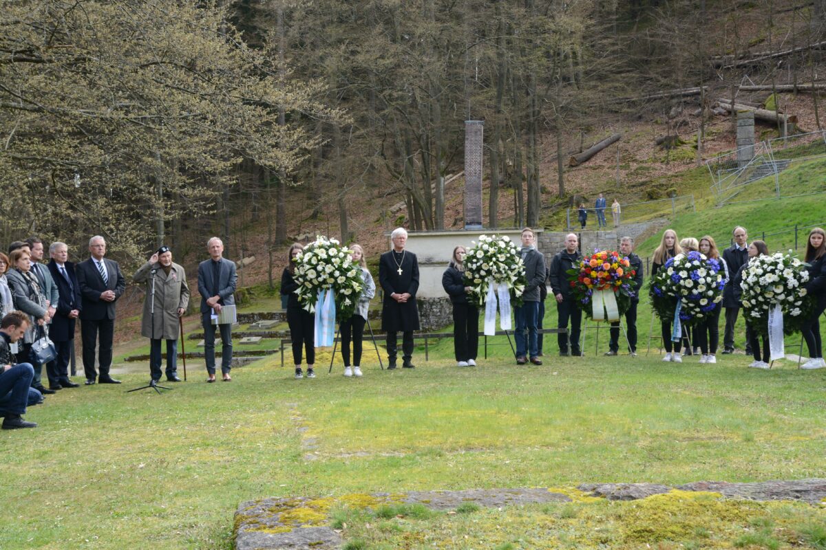 An die Ansprachen schloss sich dann der Gedenkzug zu den Gedenktafeln an. Dort legten der Vertreter der ausländischen Abordnungen an den jeweiligen Gedenktafeln für die Häftlinge aus ihrer Heimat Kränze nieder. Joachim Herrmann, Karl Freller und Heinrich Bedford-Strohm legten ebenfalls Kränze nieder.