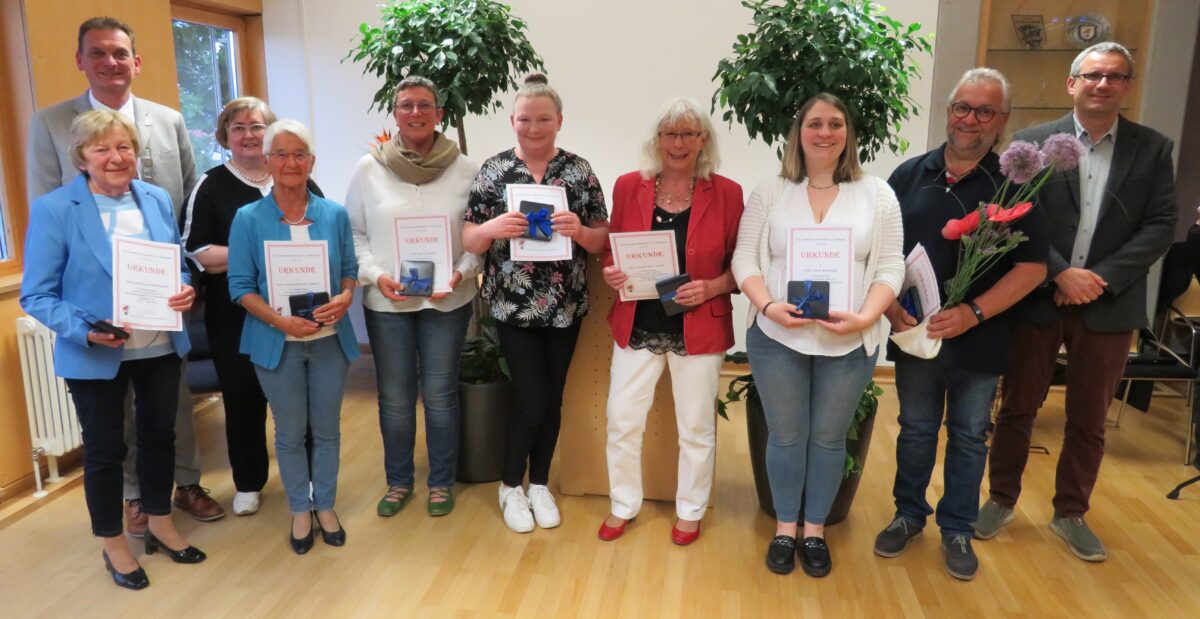 10 Bürgerinnen und Bürger zeichnete Bürgermeister Ernst Schicketanz beim Ehrenabend der Kommune im Rathaussaal für ihr ehrenamtliches Engagement aus. Leider konnten Peter Spachtholz und Klaus Joachimstaler an der Ehrung nicht teilnehmen. Postum wurden die Leistungen von Jürgen Eckert und Karl Götz für ihre Verdienste geehrt. Feierlich umrahmten die Straßenmusikanten den Ehrenabend.