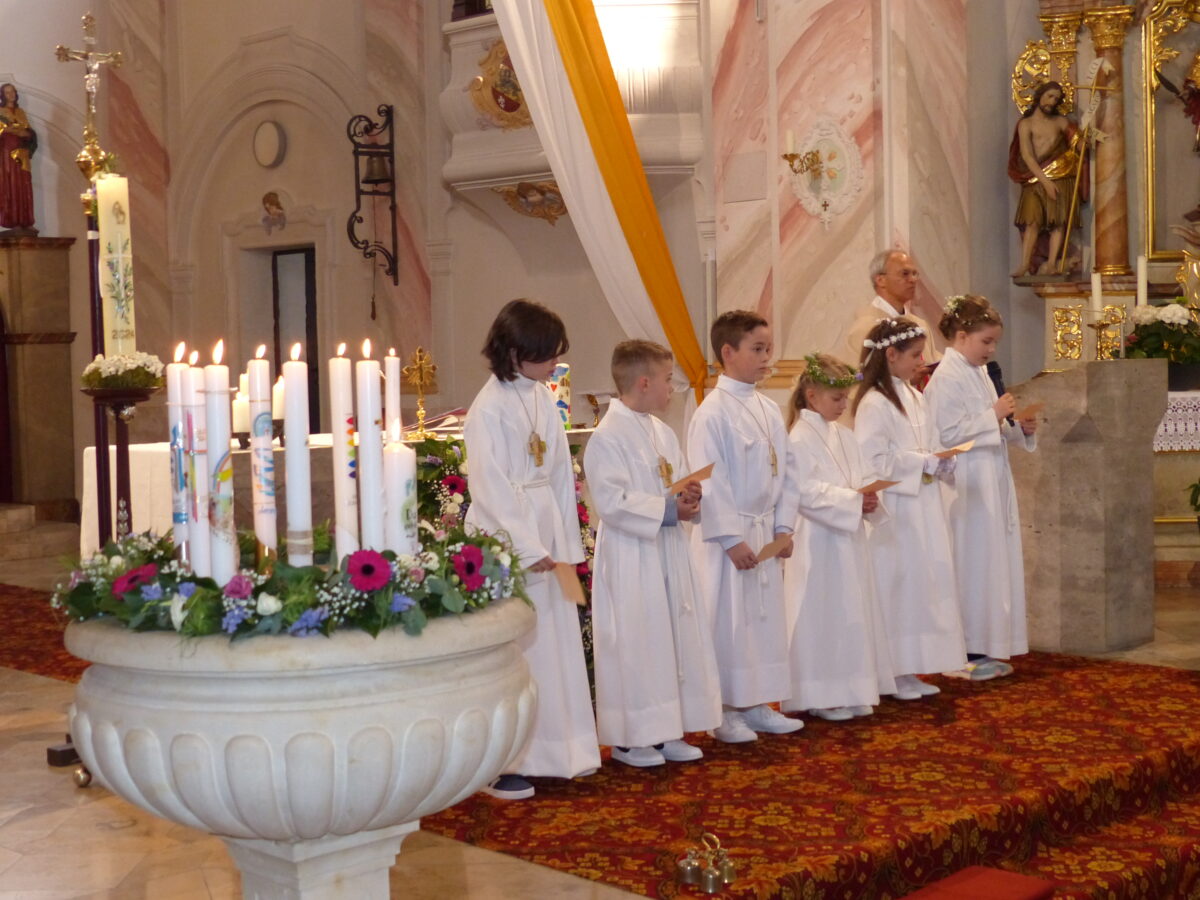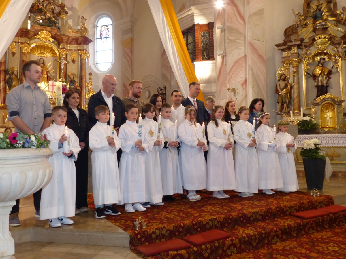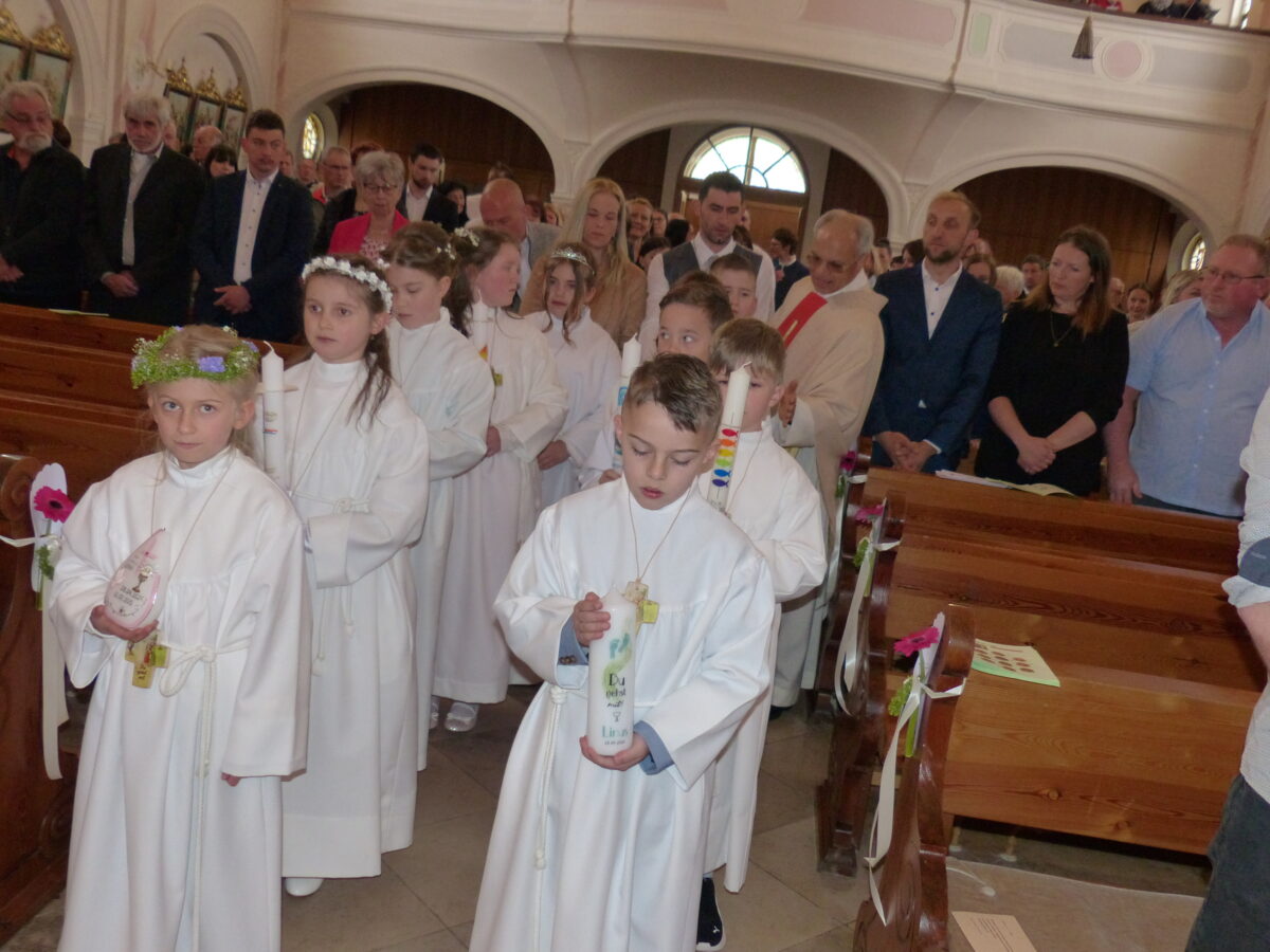 Die Kommunionkinder reihten sich vor dem Altar auf. Unter den Kommunionkindern waren ein Cousin und eine Cousine, Clara und Linus Auer, ein Geschwisterpaar, Cimerhalova Tereza und Cimerhakl Tomas, sowie Even Bauderer, Lennart Bäumler, Erik Merkel, Lena Presser, Alexandria Schultz und Maya Tormoiga. „Bei eurer Taufe wurdet ihr von eurem Taufpaten noch zum Altar getragen, heute könnt ihr selber zum Altar gehen und auch das Taufversprechen selber vortragen“, so der Geistliche. Fußabtritte waren das Symbolbild der Kommunionsfeier und des Evangeliums. „Du gehst mit“ – Jesus bleibt dann bei uns. „Helfen wir alle zusammen“, so der Geistliche, „um den Glaubensweg gemeinsam zu gehen.“