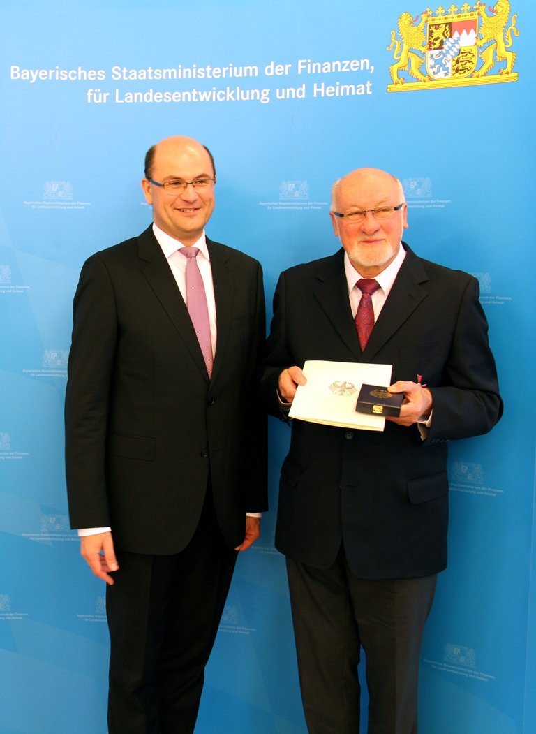 Mit diesen Worten händigte Finanzstaatssekretär Albert Füracker die Ordensinsignien des Verdienstkreuzes 1. Klasse des Verdienstordens der Bundesrepublik Deutschland an MdL a. D. Georg Stahl aus Pirk und die Ordensinsignien des Bundesverdienstkreuzes am Bande an Maximilian Karl (Altenthann, Landkreis Regensburg) aus. Füracker gratulierte bei der Feierstunde in Nürnberg am Mittwoch den Geehrten herzlich zu dieser vom Bundespräsidenten verliehenen hohen Auszeichnung für Verdienste um das Gemeinwohl.