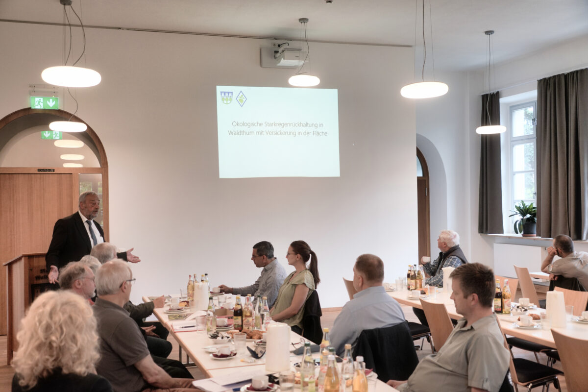 Die Marktgemeinde Waldthurn nimmt auch beim Thema „Schutz vor Starkregen“ eine Vorreiterrolle ein. Warum das so ist, wurde gemeinsam mit Vertretern aus Verwaltung, Wasserwirtschaft, Naturpark, ländlicher Entwicklung und Bauhöfen diskutiert – in Vorträgen, Gesprächen und Ortsbegehungen.