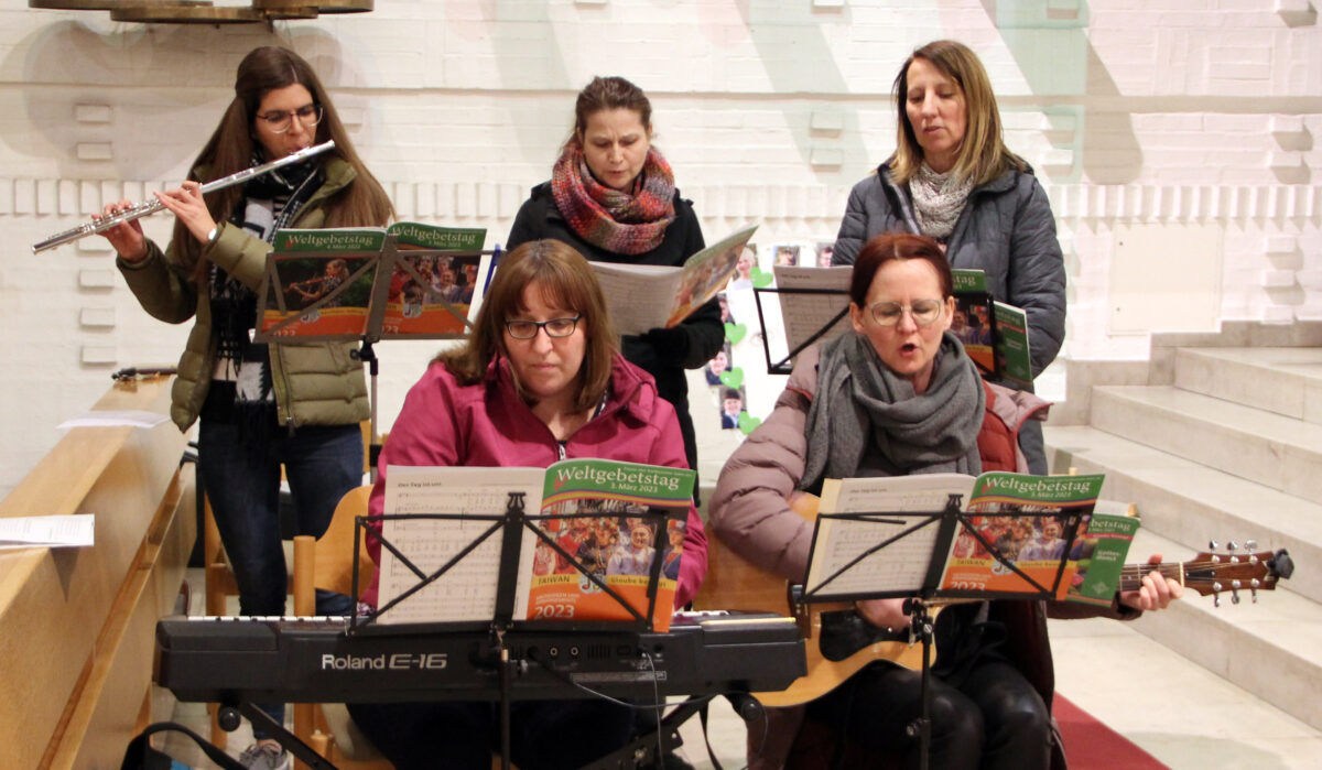Zwischen Gebeten, Schuldbekenntnissen und Fürbitten wurden immer wieder rhythmische Lieder gesungen, die mit Querflöte, Keyboard und Gitarre begleitet wurden. Es wurden fünf Dankesbriefe von Frauen vorgelesen, die von Kämpfen und Hoffnung schreiben. Sie ließen sich von den Schwierigkeiten nicht unterkriegen. Dazwischen erklang der Liedruf: „Denn ich hab von eurem Glauben gehört“. Am Ende der Andacht gab es anerkennenden Applaus.