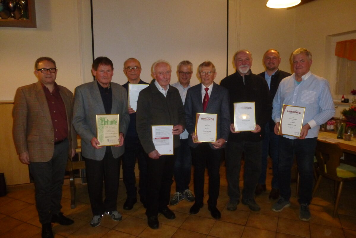 Heinz Eger, Erwin Melischko und Vereinsvorsitzender Albert Puff wurden für 25-jährige Mitgliedschaft geehrt, Siegfried Bock sogar für 40 Jahre. Weitere Mitglieder werden die Ehrungen im Rückblick erhalten. Darunter sind Karl-Heinz Fellner (50 Jahre aktiv), Alfons Ostermeier (60 Jahre Mitglied) und Hans Heindl (70 Jahre).