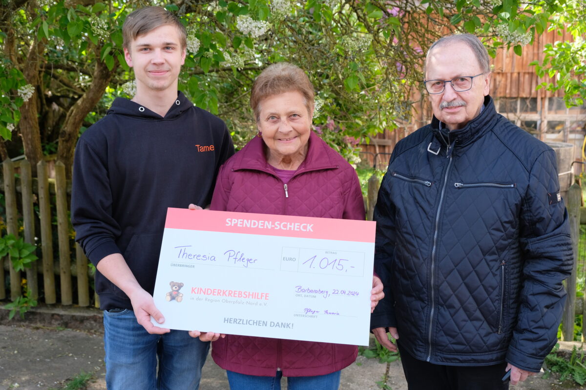 Eine großzügige Spende erreicht die Kinderkrebshilfe in der Region Oberpfalz Nord. Schon 2020 spendete Hermann Pfleger aus Anlass eines runden Geburtstags der Hilfsorganisation 1.000 Euro. Inzwischen verstorben war es jüngst Ehefrau Theresa Pfleger, die finanzielle Hilfe fortzusetzen, indem sie anlässlich ihres runden Geburtstages auf Geschenke verzichtete und stattdessen ihre Gäste um Spenden für die Kinderkrebshilfe bat. Dieser Aufruf erbrachte insgesamt 1.015 Euro. Die Übergabe des symbolischen Schecks fand in einem herzlichen Rahmen statt.