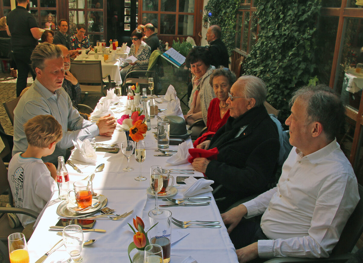 Inzwischen sitzen alle Gäste auf ihren Plätzen, studieren die Menüfolge mit viel saisonalem Spargel und freuen sich, dass sie mit Alexander heute ein Fest fürs Leben feiern dürfen. Alexanders Sohn Jonathan Fried, der mit Frau Olga und den Kindern Jakob und Daniel aus Dubai angereist ist, begrüßt die Freunde der Familie und bedankt sich auf Englisch bei den vielen Menschen, die das Ehepaar im Alltag unterstützen. „Ich kann gar nicht alle aufzählen“, sagt der Finanzjurist sichtlich gerührt.
