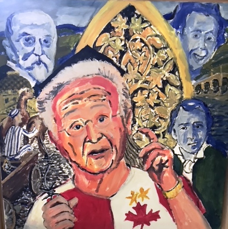 Ein besonderes Geschenk überreicht der Begleiter von Landschaftsarchitektin Kristina Hack, die die Landesgartenschau mit geplant hatte. Volker Röhrs enthüllt sein eigenhändiges Gemälde, das Alexander Fried inmitten wichtiger Stationen und wichtiger Personen seines Lebens zeigt: Dessen Frau Doro oben rechts, den Dichter Heinrich Heine darunter, den tschechoslowakischen Philosophenpräsidenten der Ersten Republik, Tomáš Garrigue Masaryk und Frieds Fahrt auf einer Pferdekutsche nach der Befreiung.