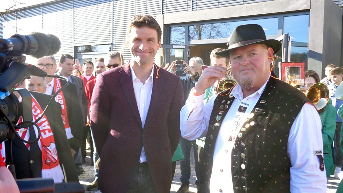 Um 12.45 Uhr war es dann mit 15-minütiger Verspätung so weit, Thomas Müller wurde mit lauten Salutschüssen sowie einem Ständchen der Kapelle heimatlich kulturell begrüßt. Bernd Hofmann, Präsident des FC Bayern-Fan-Clubs Nabburg, nahm den Ehrengast in Empfang, das Signal für die nächsten Böllerschüsse gab der Weltmeister dann schon höchstpersönlich. Frenetisch und mit lauten Thomas Müller-Rufen wurde der zwölffache Deutscher Meister beim Einzug in die Halle gefeiert.