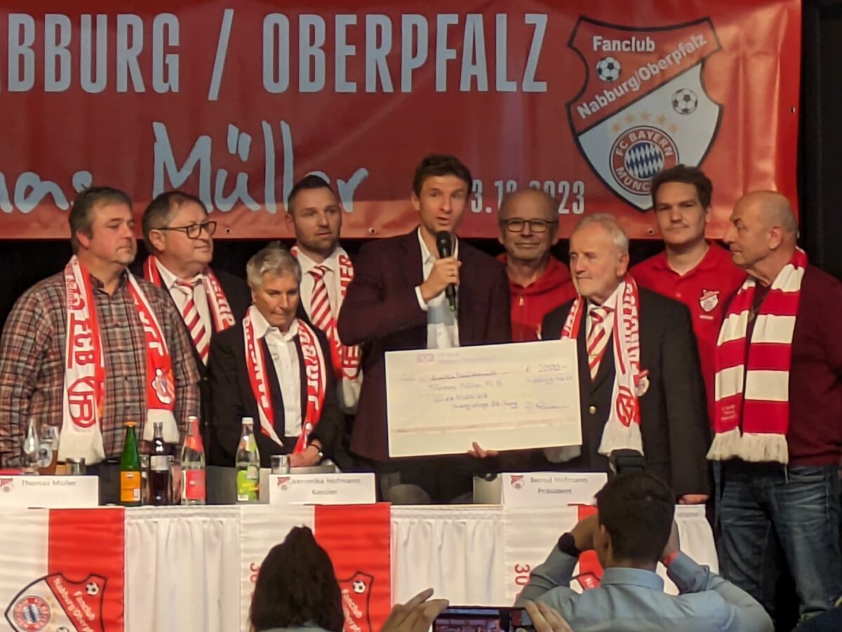 Der 6150 Mitglieder starke Bayern-Fan-Club Nabburg konnte die Lücke des 6000. Mitglieds mit der Ernennung Müllers zum Ehrenmitglied erfolgreich schließen und obendrein gab es noch einen großzügigen Scheck über 2000 Euro für die Nicolaidis-Young Wings-Stiftung (zielgruppengerechte Beratung für Trauernde), die Thomas Müller unterstützt und sehr am Herzen liegt.
