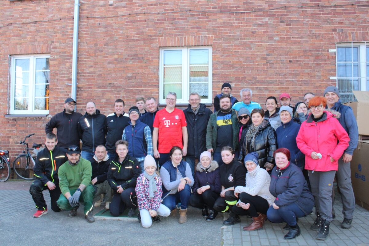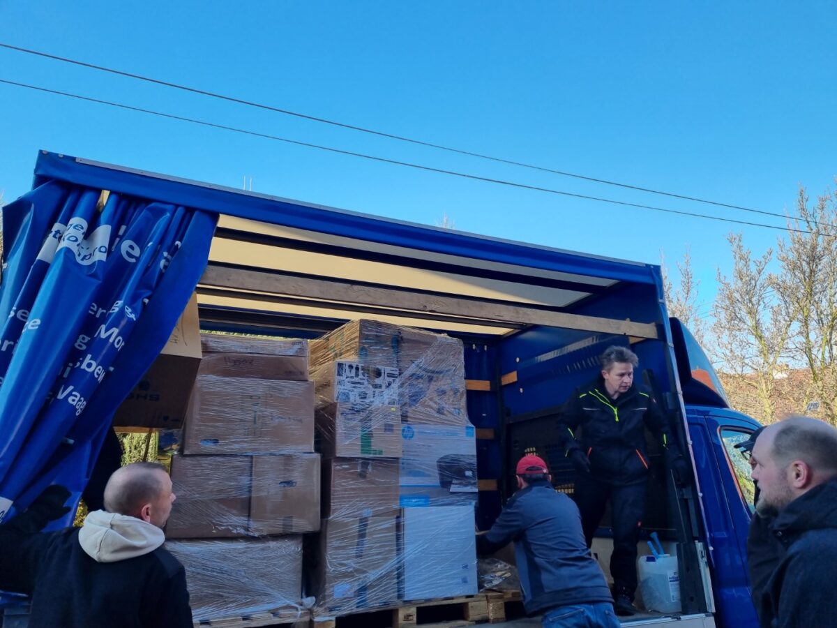 Nach neunstündiger Fahrt kam die Gruppe gegen 22 Uhr im polnischen Kluczbork an, wo die Fahrzeuge auf einem bewachten Parkplatz abgestellt und die Fahrer in die Unterkünfte gebracht wurden. Am Samstag ging es nach einem ausgiebigen Frühstück nach Borkowice ins Gemeindezentrum, wo die acht Fahrzeuge und vier Anhänger mit Hilfe örtlicher Freiwilliger entladen wurden.