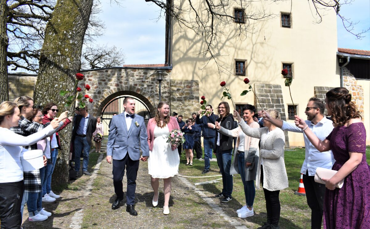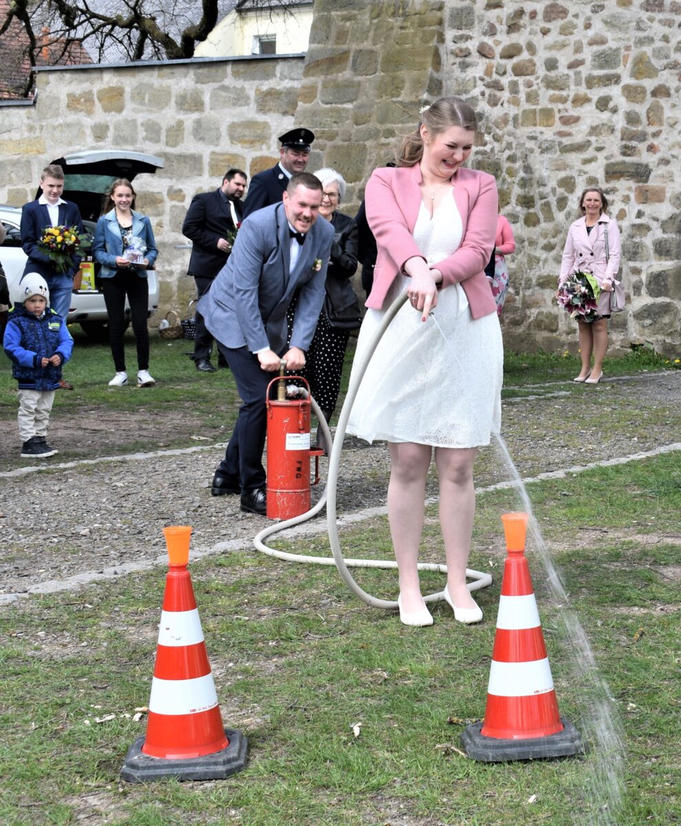 In der Grafenwöhrer Feuerwehr ist Jonas zudem Zugführer. Alles Gute wünschte der Grafenwöhrer Vorsitzende der Wehr Alexander Richter. Dem schlossen sich Frank Neubauer, der Vorstand der Grafenwöhrer Stadtwerke an, der dem 29-jährigen Wassermeister und der 25-jährigen Kinderkrankenschwester gratulierte. Einige Kolleginnen der Braut sowie Dr. Jakub Čech aus dem Amberger Klinikum „St. Marien“ standen Spalier. Teamwork bewies das junge Ehepaar gleich bei einer Löschübung.