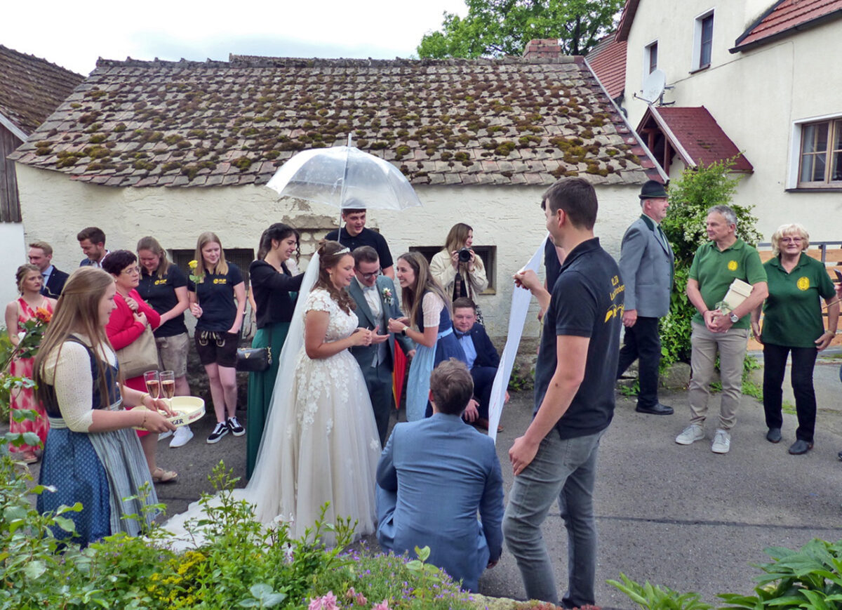 Nachdem das Paar seine Pflichtaufgaben absolviert, ein Herz ausgeschnitten und durchschritten hatte, stand nach der kirchlichen Zeremonie eine lange Reihe von Abordnungen Spalier vor dem Gotteshaus, um dem frisch vermählten Paar zu gratulieren. Iris Wittmann, Leiterin des Kindergartens „Haus der kleinen Hände“, Kolleginnen und Kinder überreichten der 25-jährigen Braut Lisa, Erzieherin in Oberwildenau, selbstgebastelte Geschenke.
