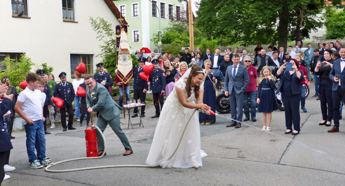 Die Döllnitzer Wehr mit dem Vorsitzenden Johann Kellner ließ das Brautpaar freilich nicht unbespritzt davonkommen: Die beiden frisch Vermählten mussten an der Handspritze mit dem Schlauch einen Löscheinsatz meistern. Nach dieser Tortur ging es mit dem Brautauto, einem geschmückten Oldtimer Mercedes/8 von 1970, ins Hotel Post nach Tännesberg, um mit der Schar der Hochzeitsgäste beschwingt zu feiern.