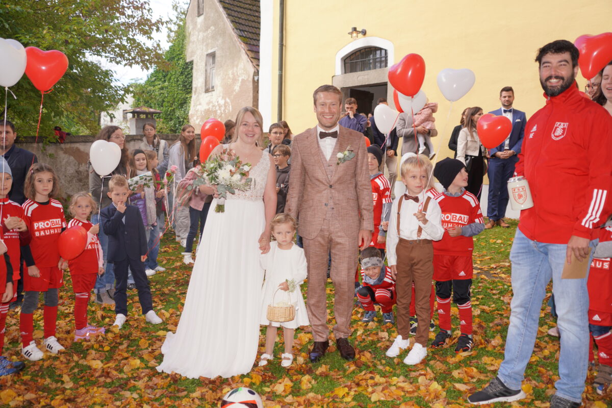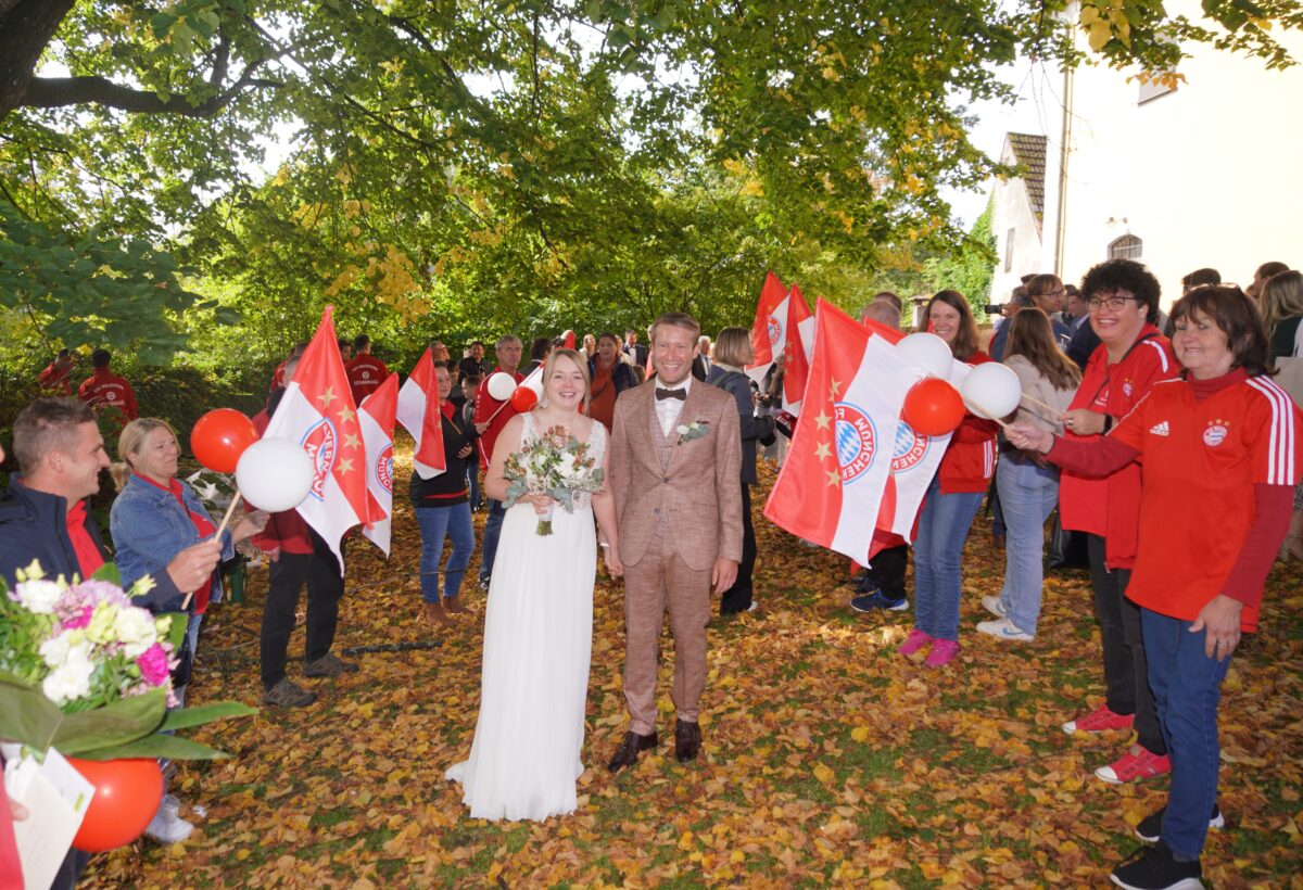 Matthias ist auch als Zweiter Vorsitzender in der Chefetage des FC Bayern Fanclub Waldthurn. Im Lennesriether Kirchgarten durften deshalb nach der kirchlichen Trauung die Bayernfans nicht fehlen, um herzlich zu gratulieren. Auch eine Abordnung des FSV Waldthurn war gekommen, Matthias war früher Torgarant und ist nun als Betreuer für seinen Heimatverein unterwegs. Auch die jungen Nachwuchsfußballer der F-Jugend gratulierten ihrem Trainer und dessen Braut.
