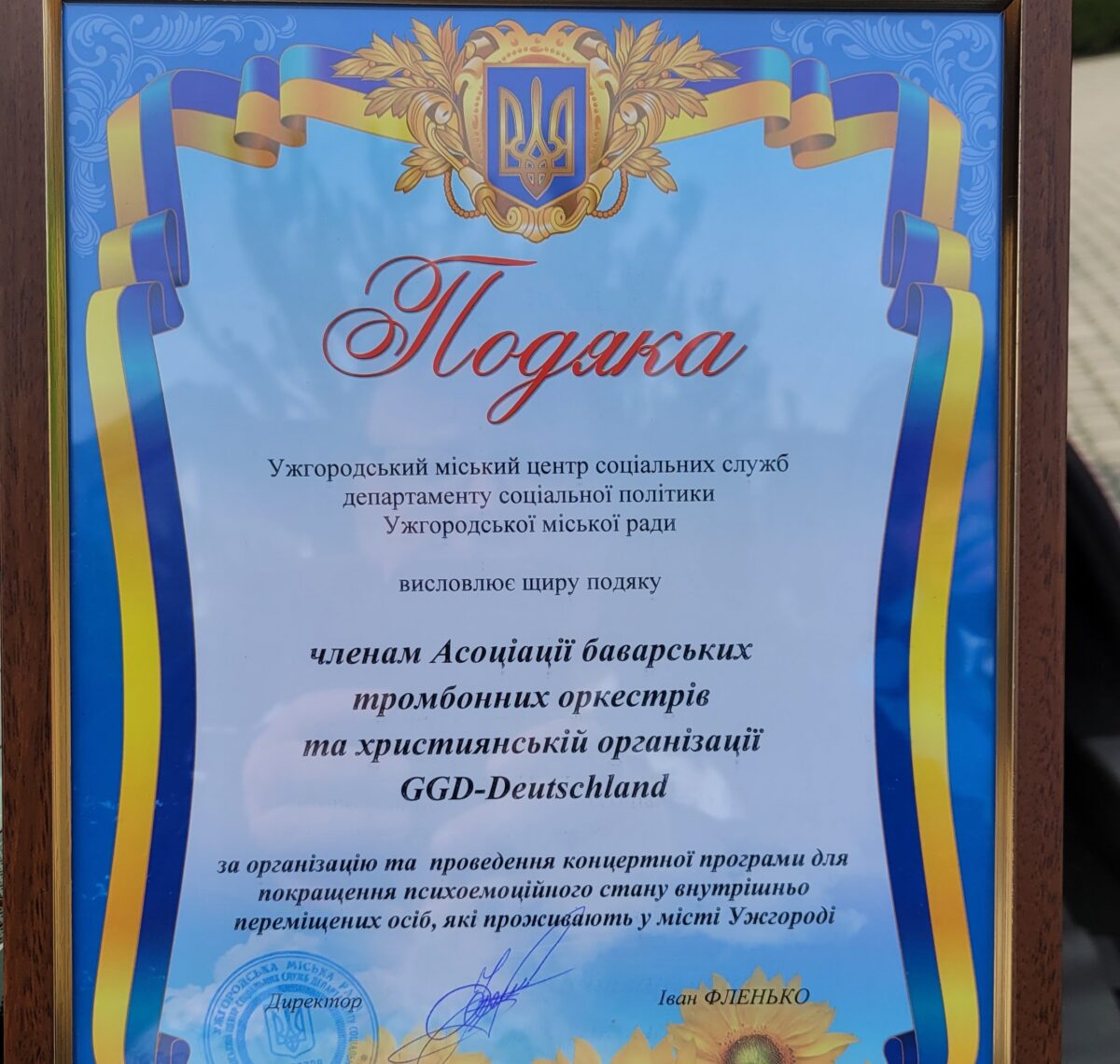 Am letzten Tag vor der Heimreise musizierte der Posaunenchor in der Kirche „The Church of Living God“ in Mukatchewo vor etwa 250 Personen, darunter viele Kinder. Für die sei es ein besonderes Fest gewesen. In diesem Zentrum werden jede Woche Hunderte Menschen aus den Kriegsgebieten unterstützt. Nicht nur die Kinder erhielten kleine Geschenke, sondern auch die Reisegruppe wurde mit einem selbstgebastelten ukrainischen Friedensengel und Schokolade bedacht.