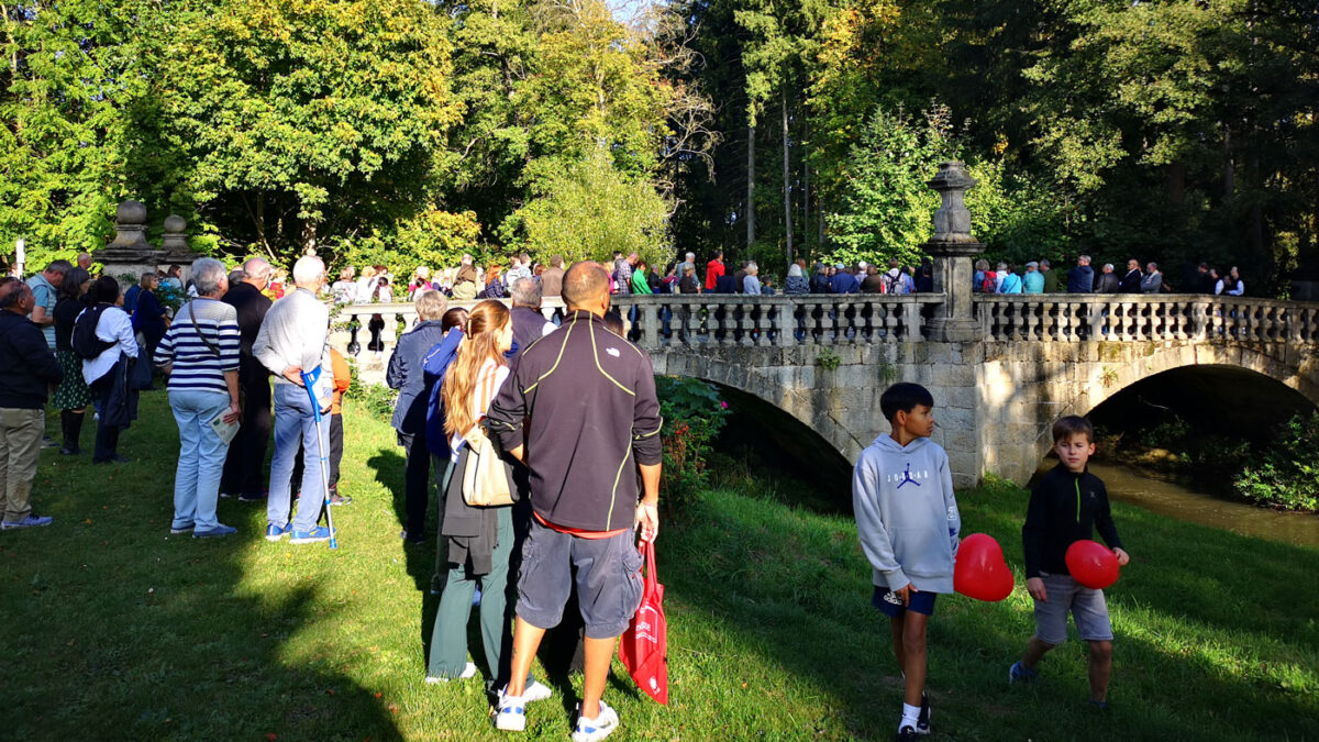 Die Andacht gestaltete sich als „Ge(h)bet“, also als Spaziergang mit drei Stationen rund um das Kloster: Am Beginn des Klostergartens, auf der Brücke über die Wondreb und am Ufer des Flusses.