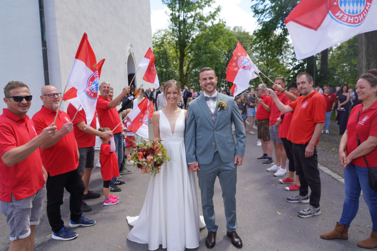 “Die Freude soll in eurer Ehe im Vordergrund stehen, meinte der Geistliche. “Lasst die Liebe hinausstrahlen über eure Beziehung”. Julian, der Bruder des Bräutigams und seine Freunde umrahmten die Hochzeitsmesse musikalisch und berührten dabei auch mit ihren beeindruckenden Soli. Wenig überraschend war es, dass die Fußballer des FSV Waldthurn nach der Trauung am Kirchenportal standen, um ihrem “Käptn” sowie Mittelfeldstrategen und seiner Braut herzlich zu gratulieren.