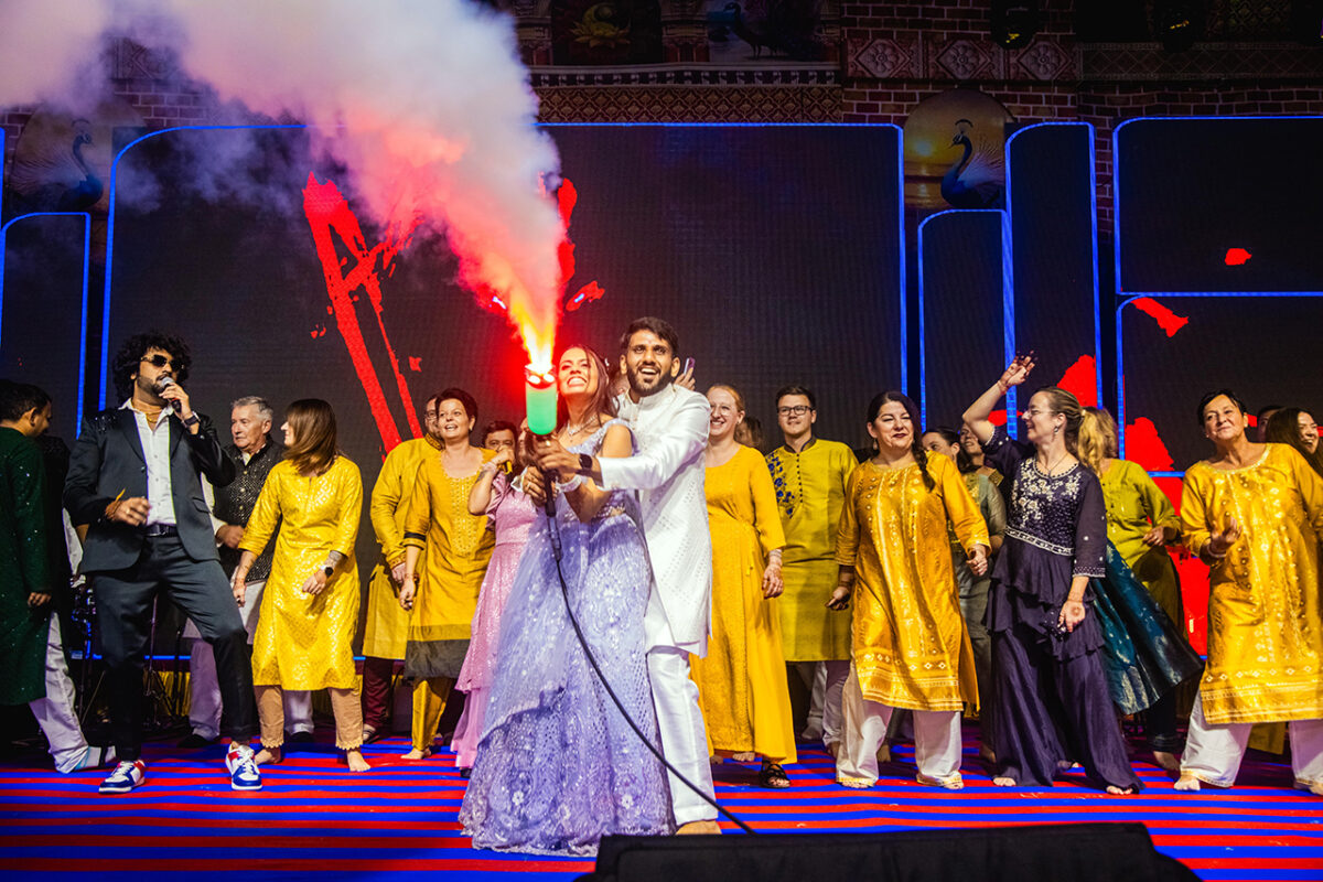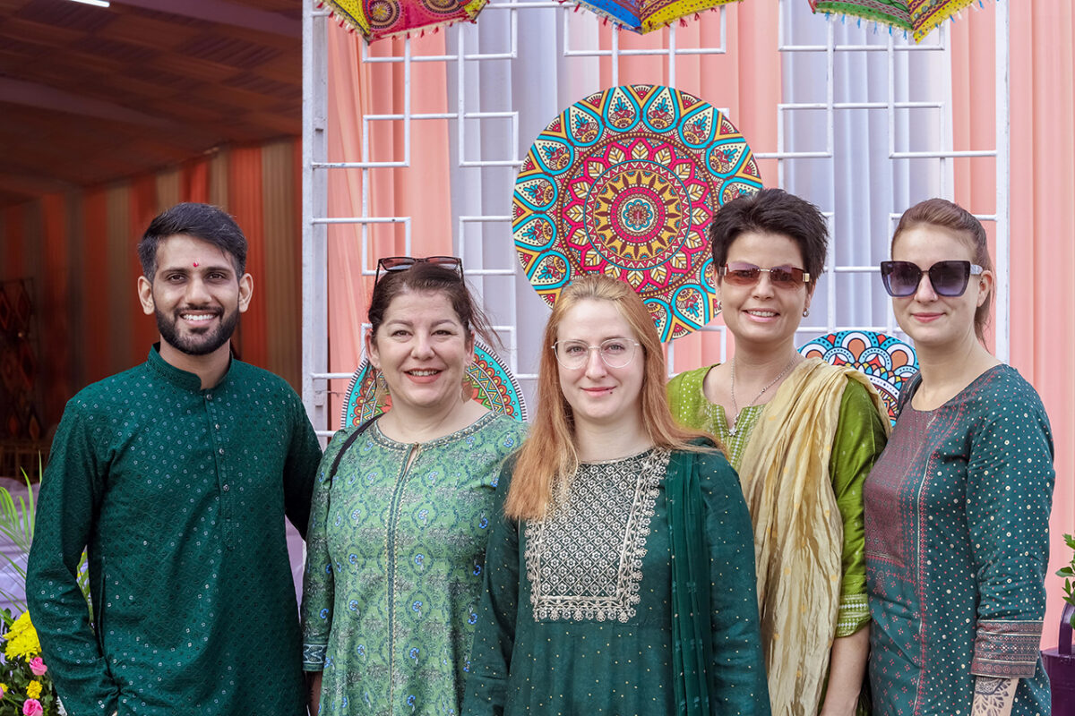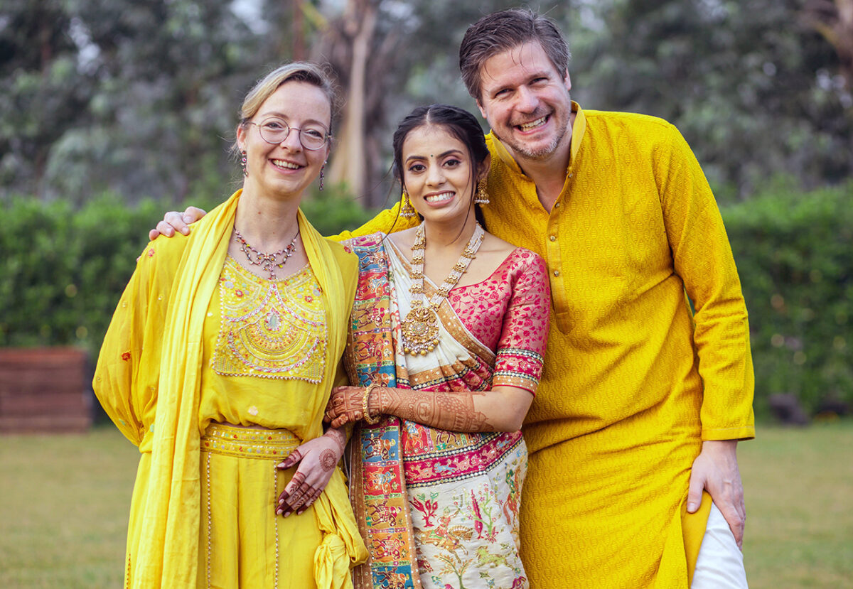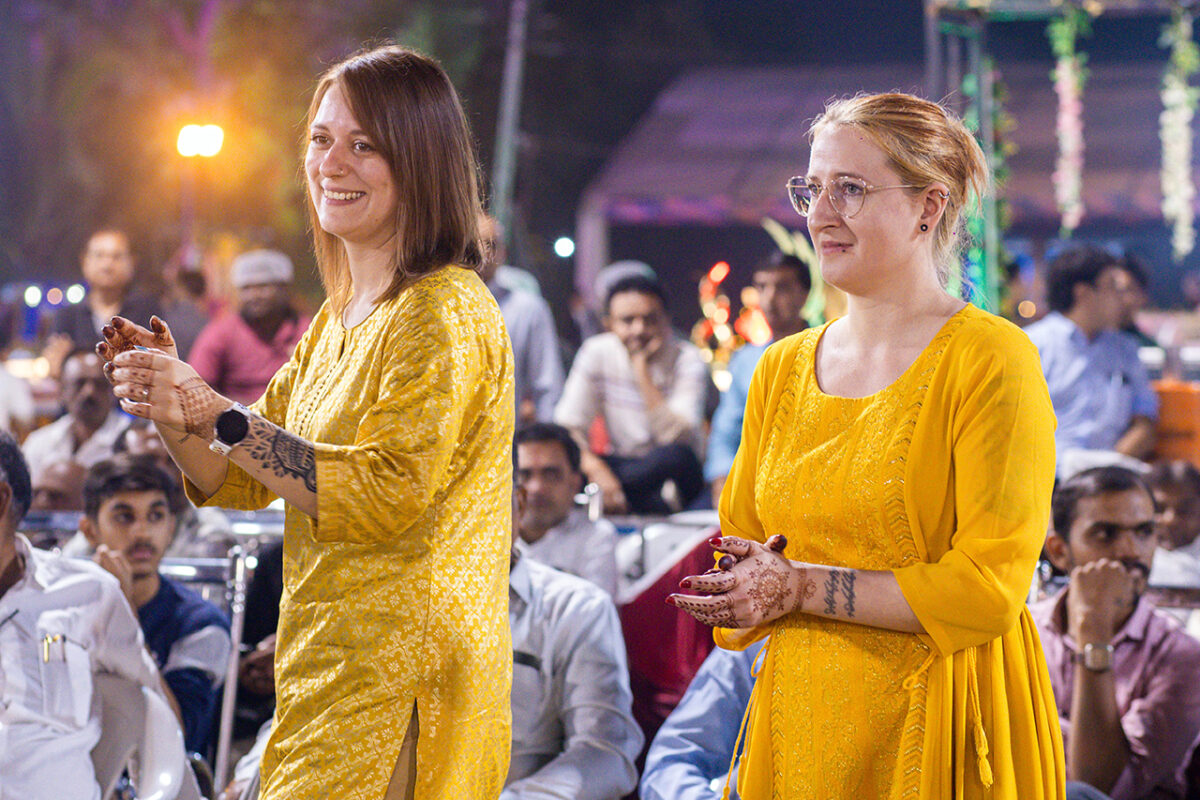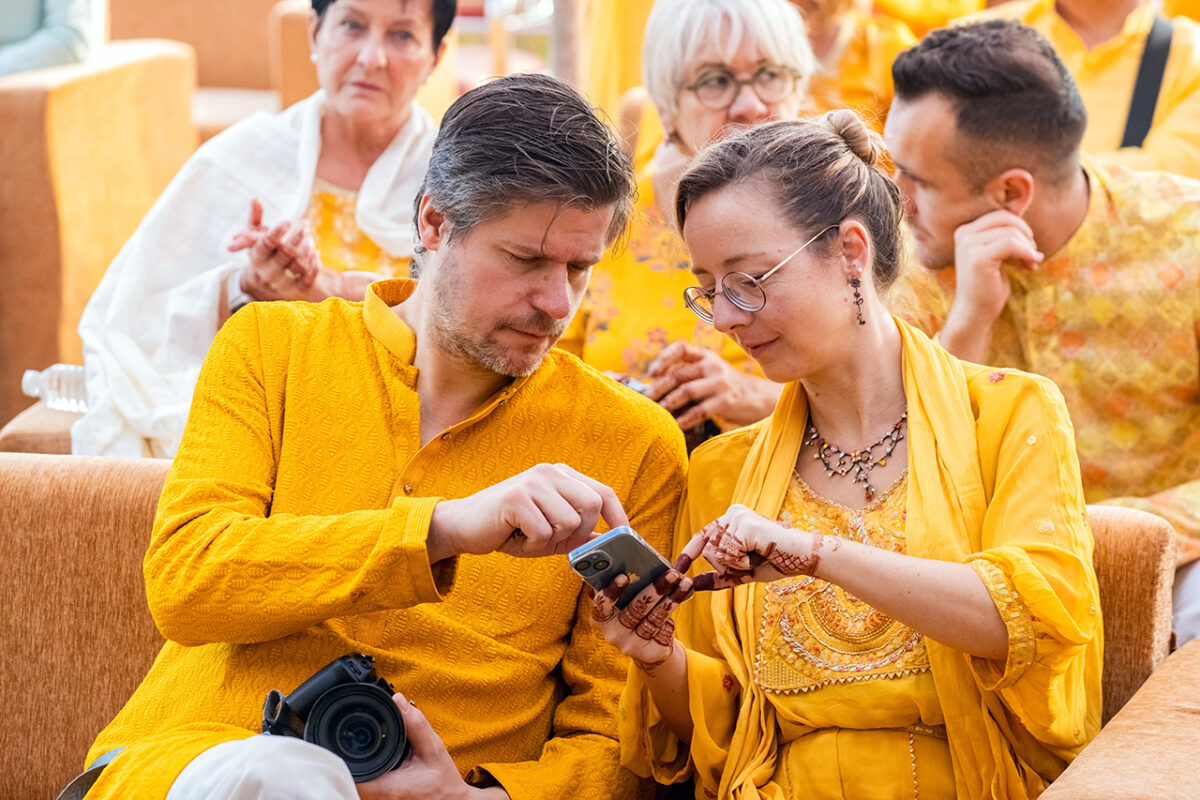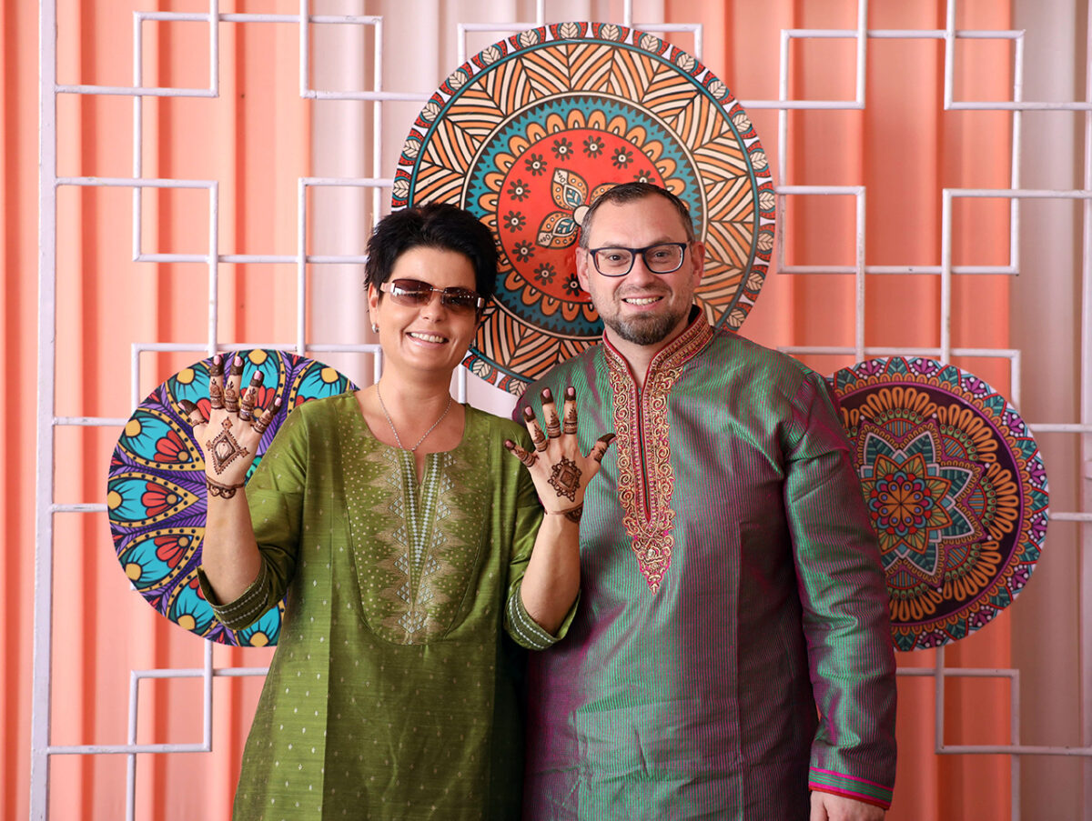 Zwei Monate dauerten die Vorbereitungen für die vier Tage dauernde Zeremonie. „An jedem Tag findet ein anderes Ritual statt“, erklärt Vishal. „Zuerst der Henna-Tag, an dem die Füße der Braut und die Hände des Bräutigams gefärbt werden.“ Es folgt der gelbe Tag mit der Musiknacht bei der Frau, an dem alle Accessoires in dieser Farbe gehalten sind. „Am dritten Tag dann die Musiknacht bei mir mit einem Team von 10 bis 12 Musikern und Sängern.“ Das sieht dann schon sehr nach Bollywood aus, wenn alle bis in die Morgenstunden tanzen. „Am vierten Tag findet die richtige Hochzeit mit einem Priester statt“, fährt Vishal fort. „Wir drehen uns siebenmal um uns, damit wir die nächsten sieben Leben zusammen verbringen.“
