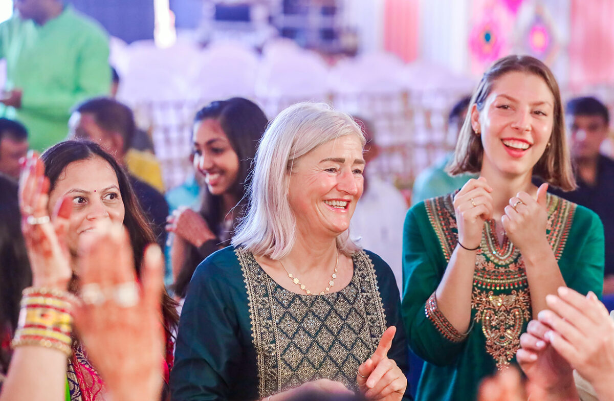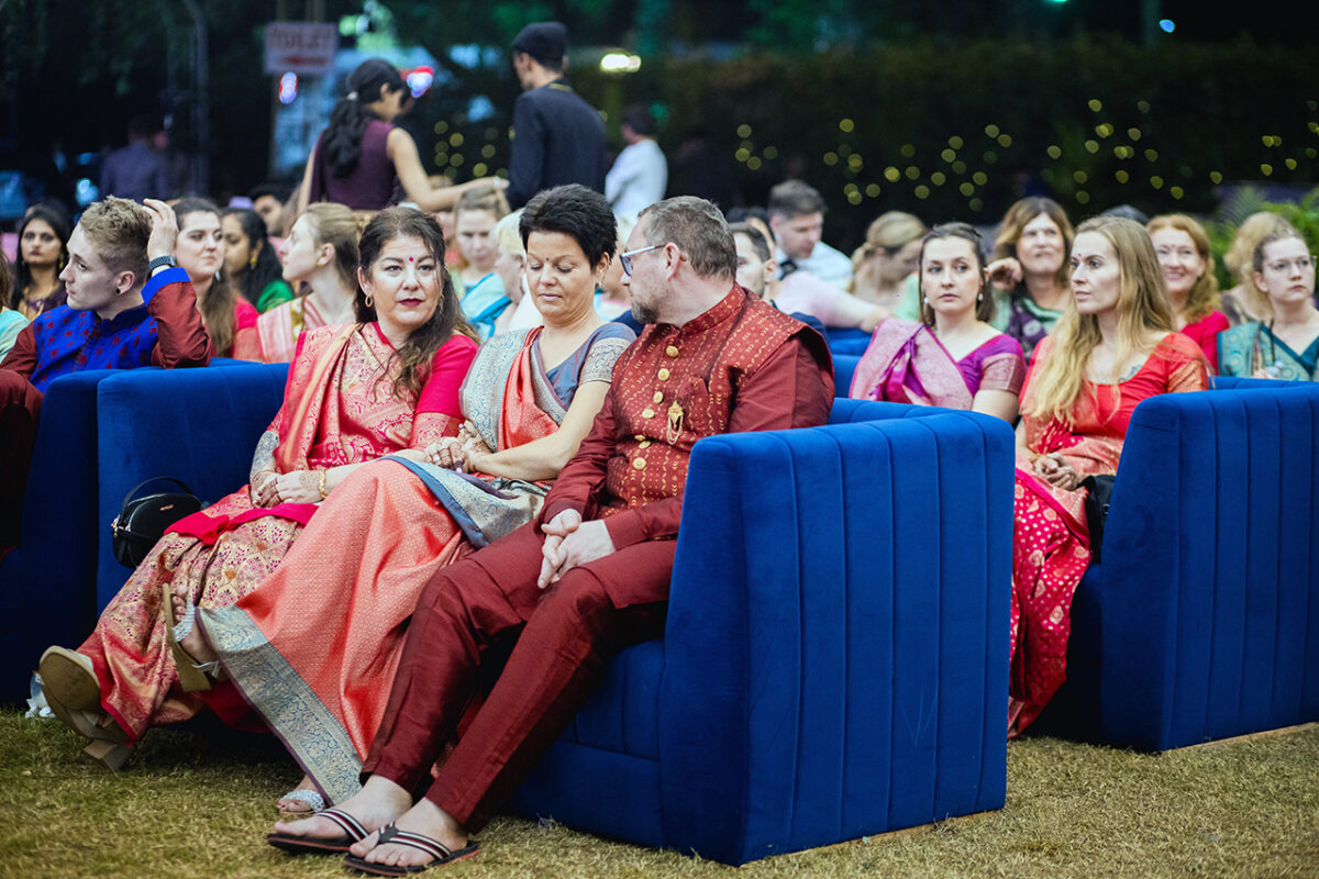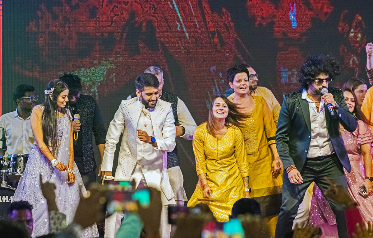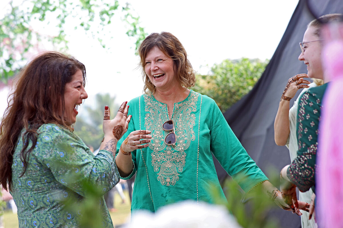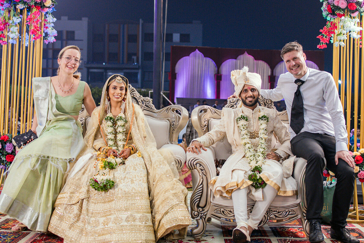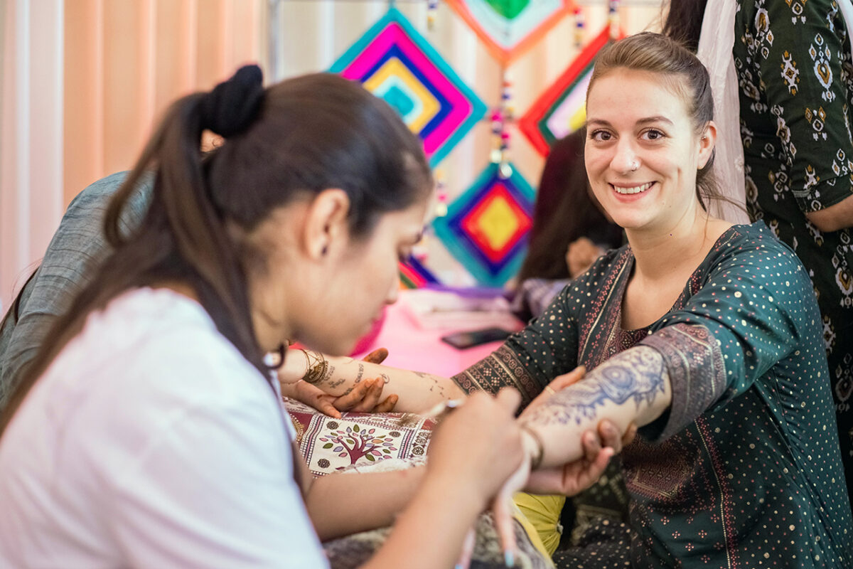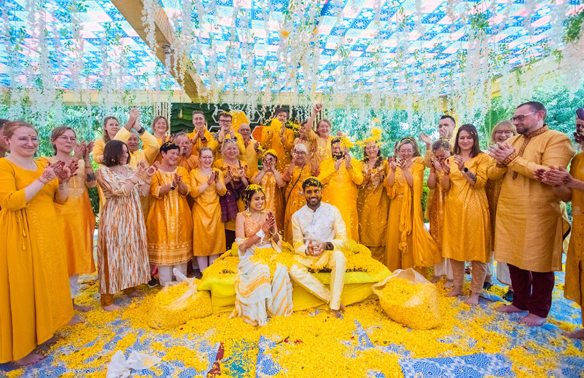Zwei Monate dauerten die Vorbereitungen für die vier Tage dauernde Zeremonie. „An jedem Tag findet ein anderes Ritual statt“, erklärt Vishal. „Zuerst der Henna-Tag, an dem die Füße der Braut und die Hände des Bräutigams gefärbt werden.“ Es folgt der gelbe Tag mit der Musiknacht bei der Frau, an dem alle Accessoires in dieser Farbe gehalten sind. „Am dritten Tag dann die Musiknacht bei mir mit einem Team von 10 bis 12 Musikern und Sängern.“ Das sieht dann schon sehr nach Bollywood aus, wenn alle bis in die Morgenstunden tanzen. „Am vierten Tag findet die richtige Hochzeit mit einem Priester statt“, fährt Vishal fort. „Wir drehen uns siebenmal um uns, damit wir die nächsten sieben Leben zusammen verbringen.“