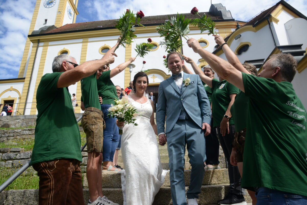 Nach der kirchlichen Trauung standen die Vereine regelrecht in Schlange an, um dem frisch getrauten Paar zu gratulieren. Da waren Abordnungen des FC Bayern Fanclubs Rosenquarz Pleystein, verschiedene Abteilungen des TSV Pleystein dabei, die ihre Glückwünsche mit ihrem jeweiligen Sportgruß abschlossen.