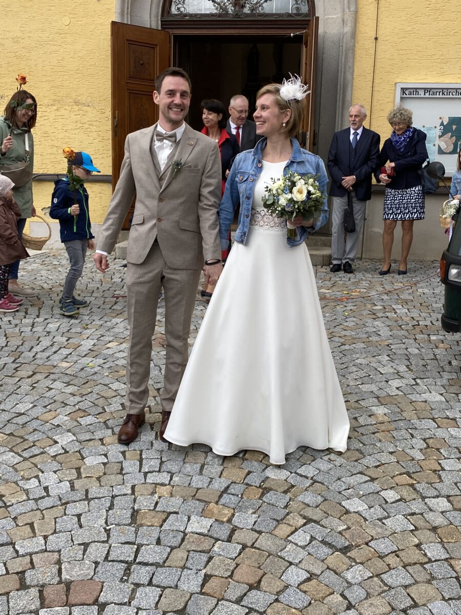 Bei der kirchlichen Trauung in der Heimatkirche Tännesberg durch Pfarrer Wilhelm Bauer umrahmte Julia Schönberger und Norman Schelter musikalisch die Feierlichkeiten. Vor der Kirche wartete schon eine Abordnung Kolpingsfamilie Tännesberg, bei dessen Fanfarenzug Katharina lange Zeit mitspielte und ließ das Brautpaar hochleben.