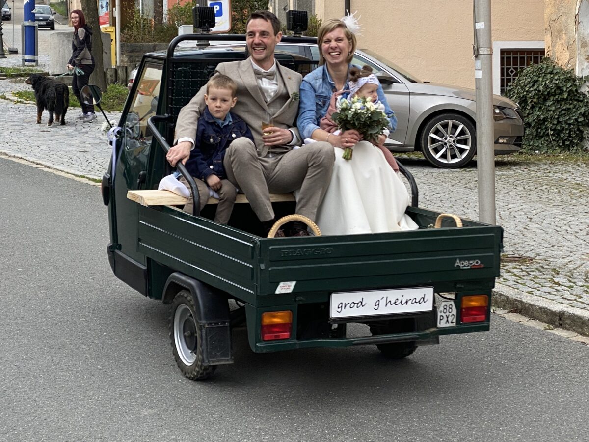 Zur anschließenden Feier in der „Ledererscheune“ waren es zwar nur ein paar Schritte, wo „D´ Stodara & Er“ aufspielten, aber Bruder Johannes ließ es sich nicht nehmen, das Brautpaar in seiner „Luxuslimousine Ape Piaggio“ zu chauffieren.