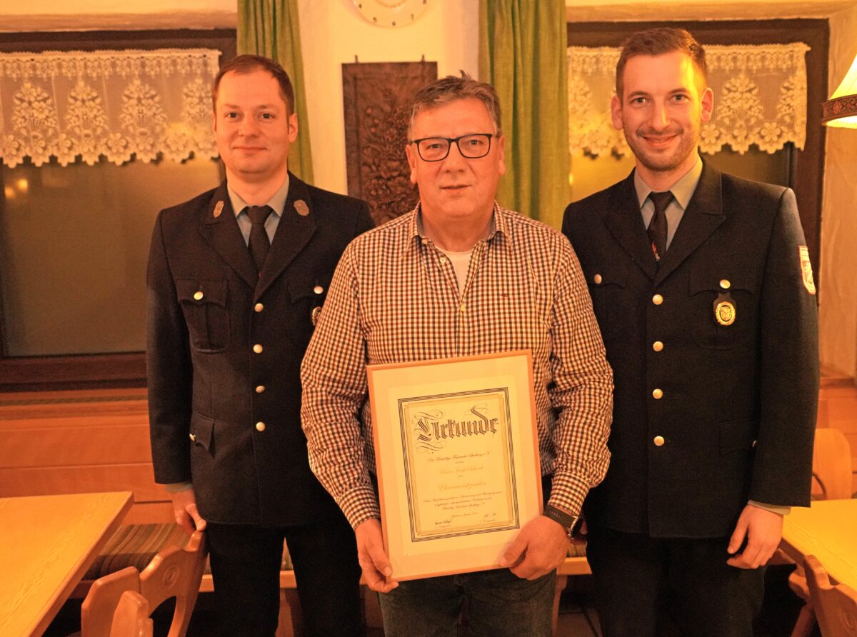 „Diese Urkunde geht an Josef Schwab, der für seine langjährige, ehrenamtliche Tätigkeit in der Vorstandschaft als Ehrenvorsitzender der FFW Spielberg geehrt werden soll“ Er ist seit beeindruckenden 47 Jahren in der Spielberger Wehr engagiert und hat dabei eine Vielzahl von wichtigen Aufgaben übernommen.