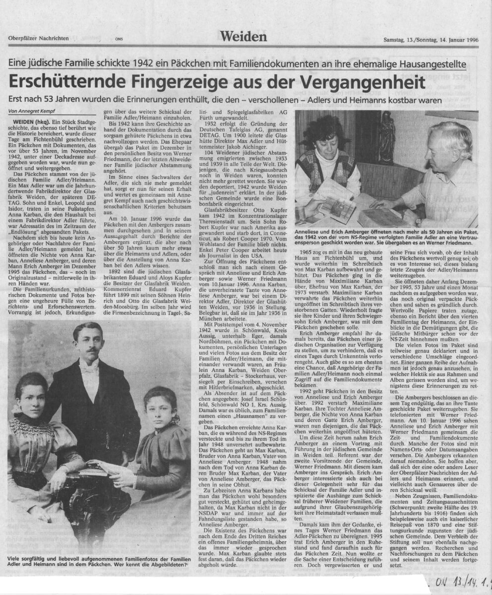 Das Paket war 1942 der früheren Haushälterin Anna Karban zur Verwahrung gegeben worden. Es wurde nie abgeholt. Die Weidenerin vererbte es an ihre Nichte weiter, die es 1996 der Jüdischen Gemeinde Weiden gab.