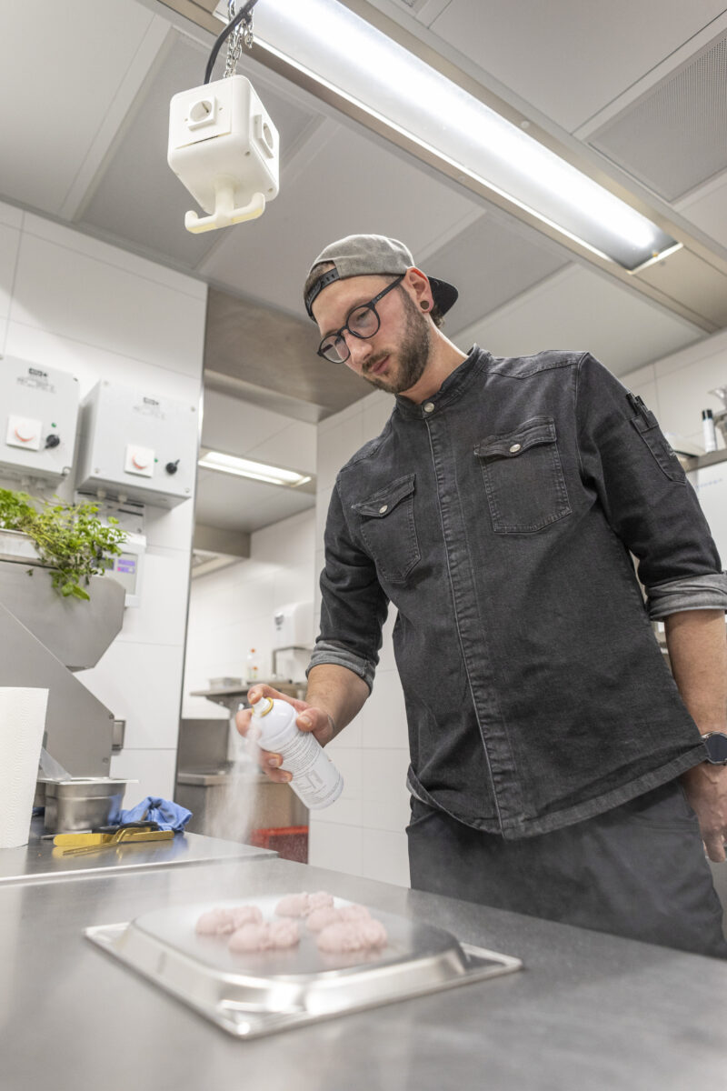 Ebenfalls hinter Glas befindet sich das Refugium von Ingo Mark. Zusammen mit dem Chefkoch zaubern drei weitere Köche, ein Auszubildender und mehrere Küchenhilfen die leckeren Gerichte. Der junge Koch mit reichlich Erfahrung – unter anderem arbeitete er schon im Mittenwalder Posthotel, in Alexander Herrmanns Posthotel in Wirsberg oder im Elements in Weiherhammer – möchte, „dass sich das hohe Niveau der Einrichtung auch auf dem Teller des Gastes widerspiegelt“. Dabei sind für ihn wie gesagt kurze Wege wichtig. „Wir brauchen kein Rind aus Argentinien, wir beziehen unser Fleckvieh aus der Oberpfalz. Das reift in Dry-Age-Kühlschränken bei unserem Metzger.“