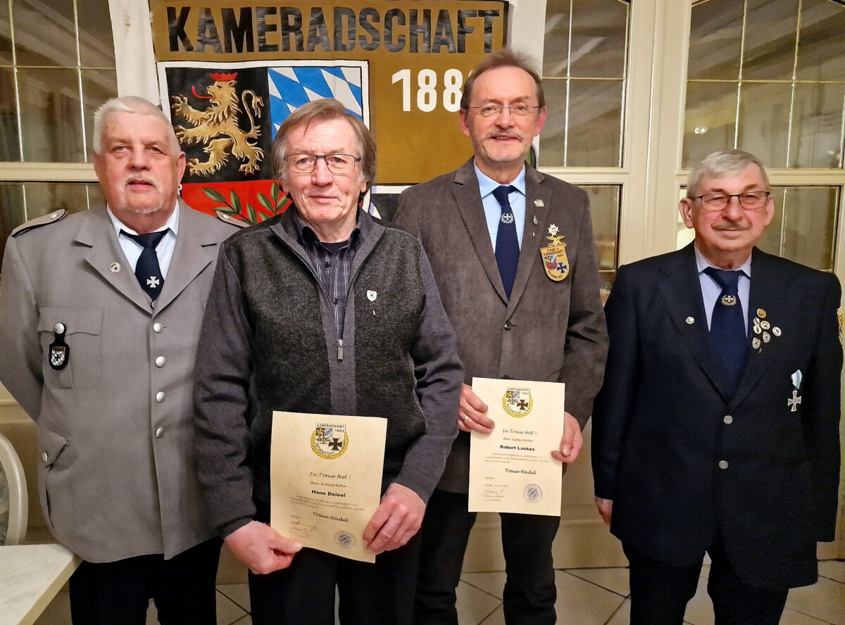Vorsitzender Alfons Landgraf erinnerte zu Beginn beim Totengedenken an die verstorbenen Kameraden und Kameradinnen des verflossenen Jahres. Zugleich galt dieses auch dem Ehrenvorsitzenden Karl Biller. Zum Jubiläum spendierte die Kameradschaft ein gastliches Abendessen. Ferner erhielten Robert Lankes und Hans Deisel die Urkunden für 50-jährige Treue zum Verein.
