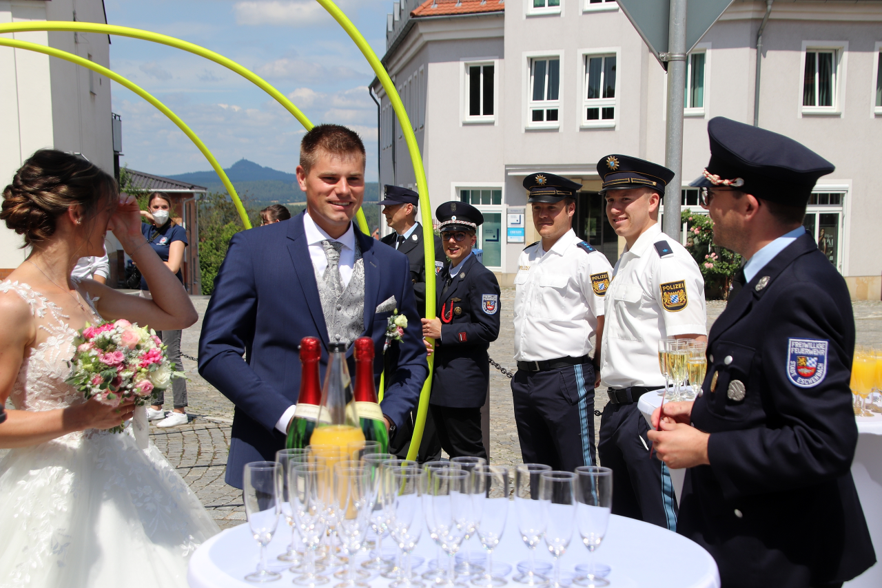 Die Trauung vollzog Stadtpfarrer Thomas Jeschner, musikalisch umrahmt von der Musikgruppe „Sin falta“ aus Grafenwöhr. Nach der Trauung standen etliche Vereine und Kollegen Spalier. Die Wasserwacht Eschenbach war genauso gekommen, wie die Kameraden der Feuerwehr Eschenbach und die Polizeikollegen von Lucas Rauch.
