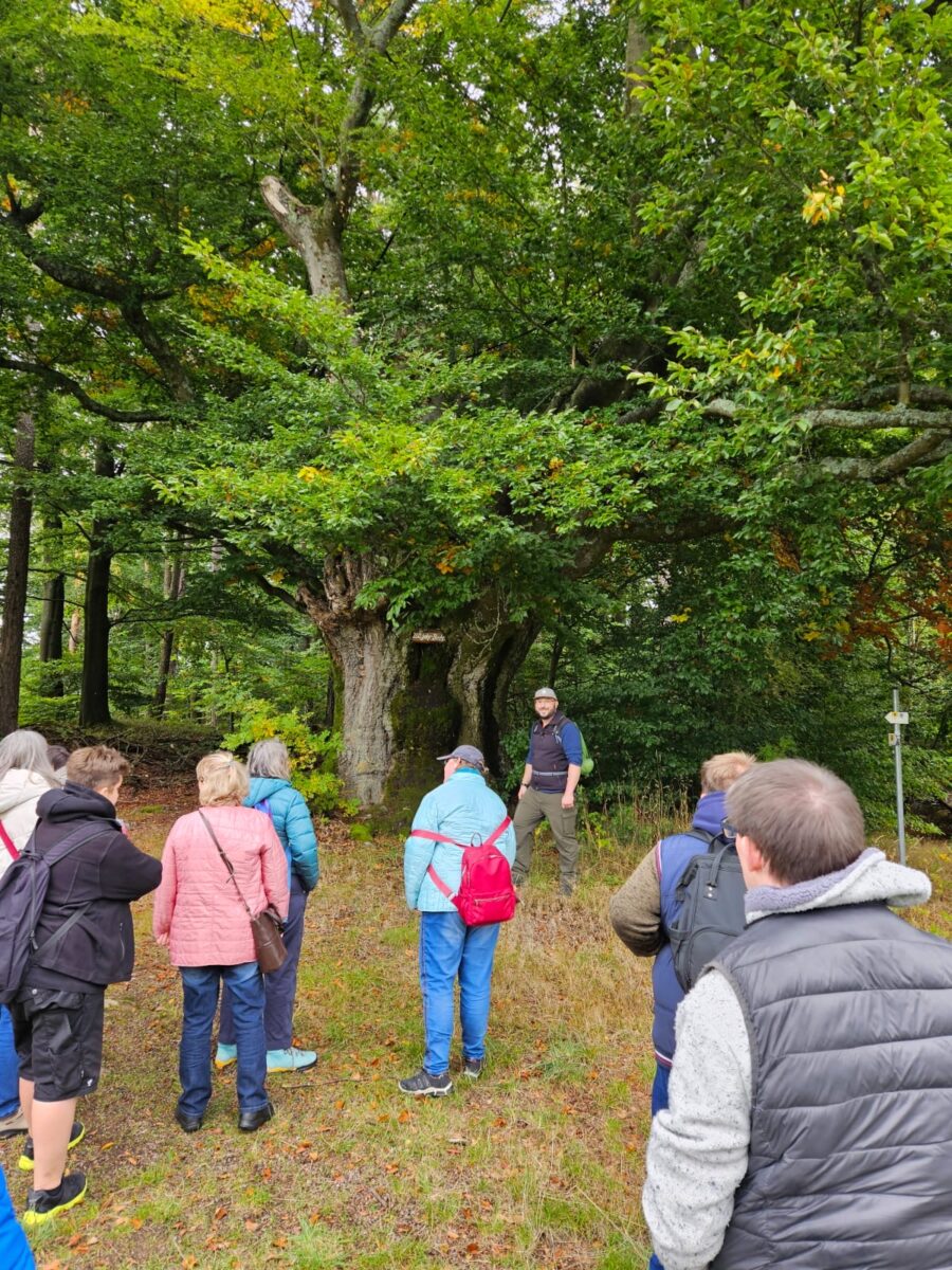 Gestartet wurde in Friedenfels am Dorfladen, um mit dem Wanderführer Alexander Schraml über Feld- und Waldwege die Natur spielerisch zu entdecken. Die Route führte die Kinder an einer über 350jährigen Buche vorbei, welche so stark war, dass über 10 Personen gebraucht wurden, um diese zu umgreifen. Mehrere Spiele zur