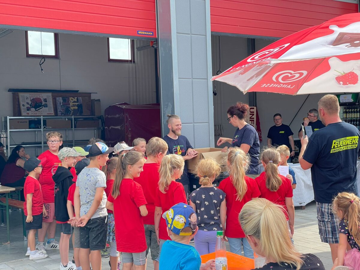 Als Anerkennung für die tolle Leistung bekam jedes Kind einen Feuerwehrturnbeutel mit Stiftemappe und natürlich einen Bratwurst- und Getränkegutschein. Der Gutschein konnte dann gleich auf dem anschließenden Gartenfest, dass zum ersten Mal abgehalten wurde, eingelöst werden. Die erste Ausgabe des Gartenfestes der Feuerwehr war gleich so gut besucht, dass am Nachmittag nochmal Bratwürste nach organisiert werden mussten.