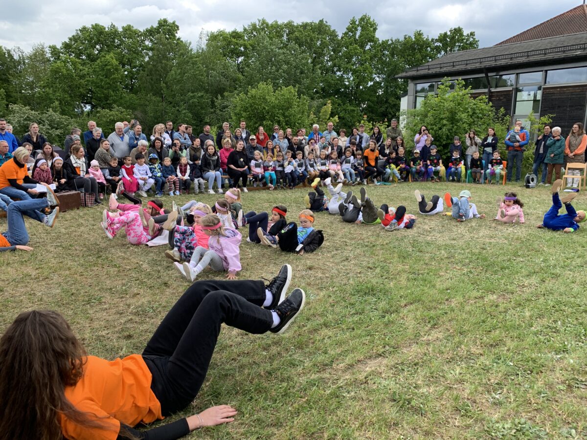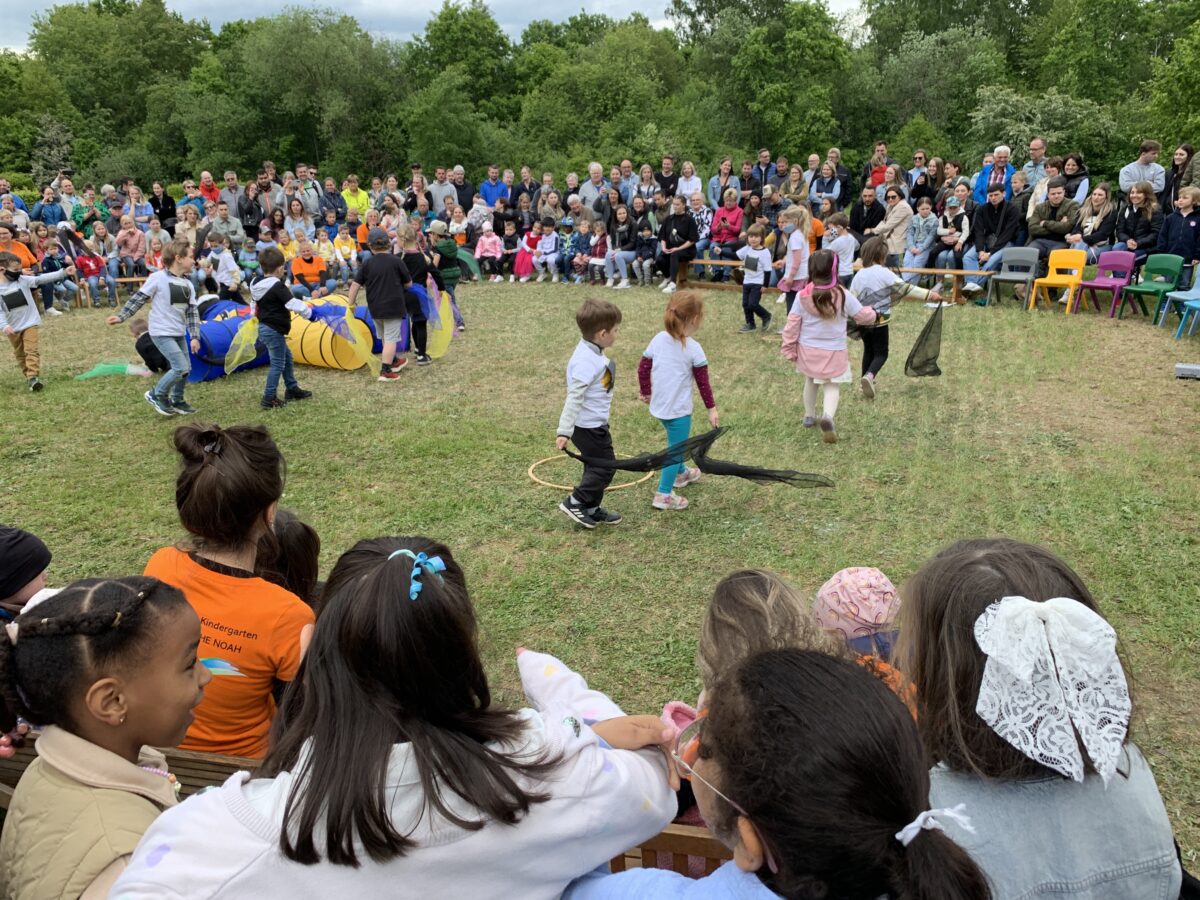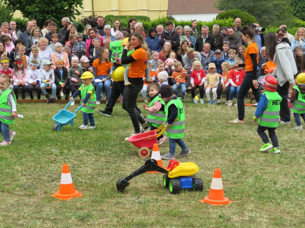 Mit den Worten „Unser Förderverein entstand, und sie nahmen gleich den Garten mühsam in die Hand“ verkündete die Gründung des Förderverein 2005 und die Umgestaltung des Gartens. Dann folgte das Dankeslied für die Erzieherinnen. Es folgt die Krippeneröffnung 2012, der Coronaschock und der 70. Geburtstag. Nach dem Abschlusslied „Jeder Tag im Kindergarten“ trafen sich die Besucher im Garten zum gemeinsamen Feiern. Für die Kids hatte die Ministranten ein Erlebnisrennen aufgebaut.