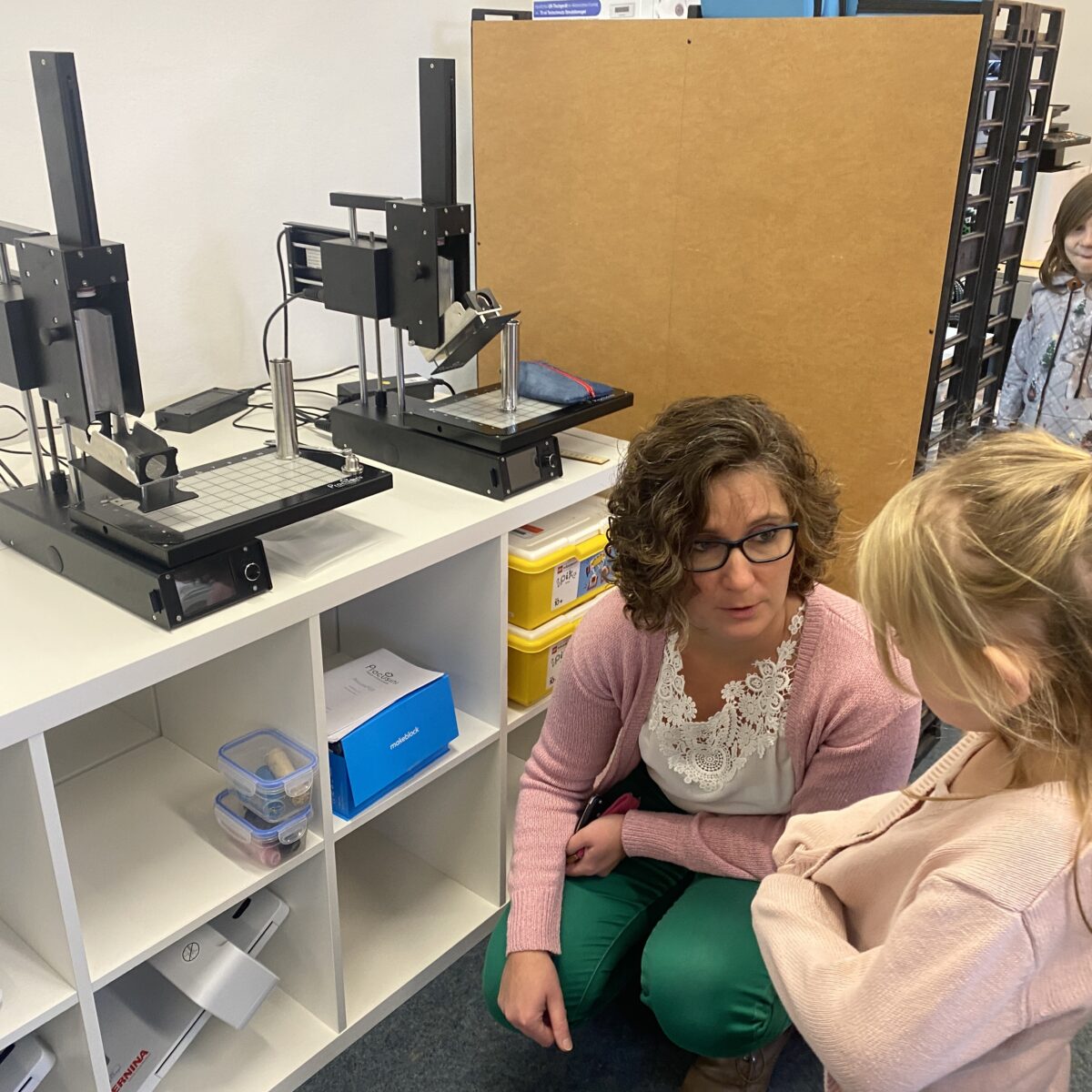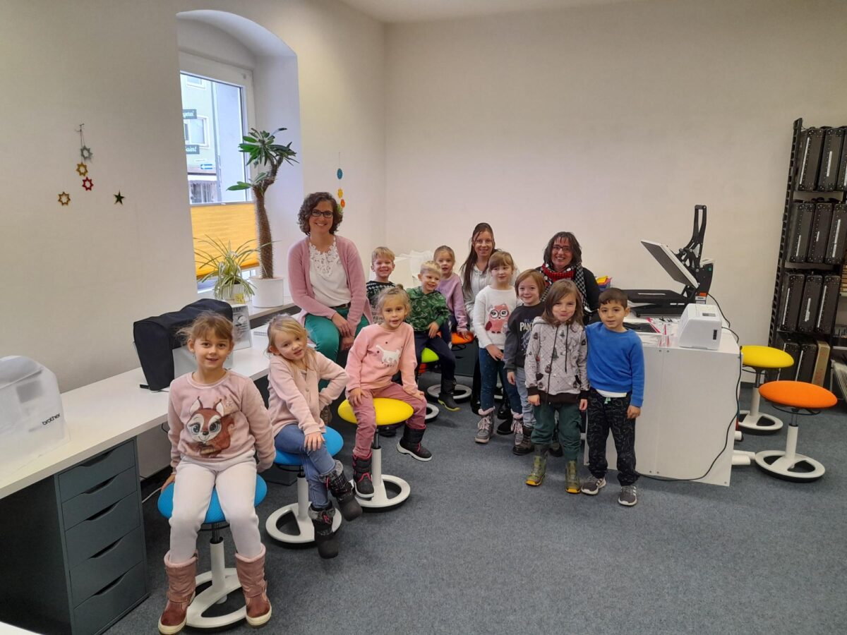 Mit strahlenden Augen wurden die Kinder im Medienzentrum empfangen, Melanie Kaiser vom Medienzentrum begrüßte die Kinder und das Erzieherteam herzlich. Zuerst gab es eine kindgerechte Einführung in die verschiedenen Bereiche des Zentrums und eine Führung durchs Medienzentrum. Mit großen Augen wurden die Heizpressen, Plotter, Stickmaschinen und Lego Boxen, aber vor allem die Schokoladendrucker bewundert.