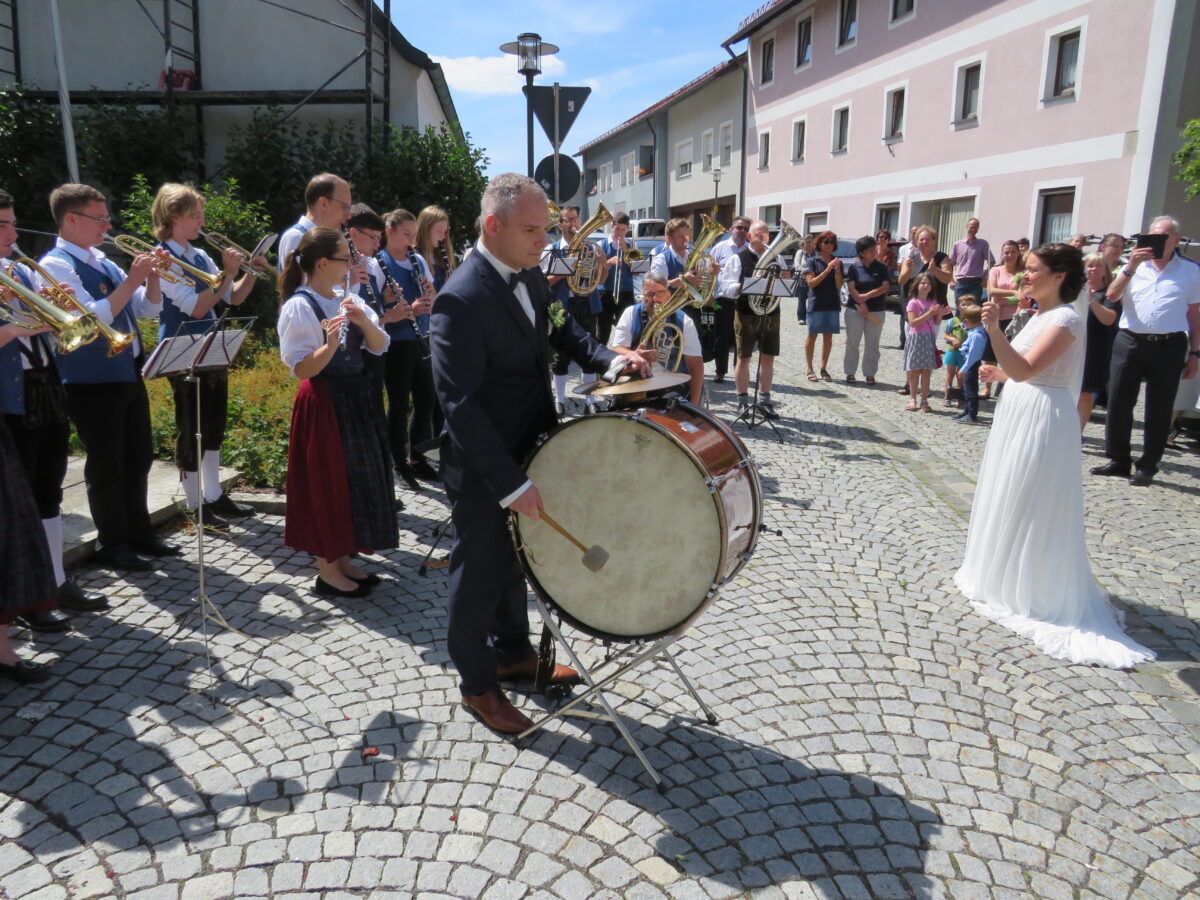 Der obligatorische Musikergruß nach der Trauung vor der Kirche ließ das Brautpaar hochleben. Die Braut durfte dann beim Dirigieren den Takt angeben. Der Bräutigam, der Schlagzeuger ist, schlug dazu die große Trommel. Die Hochzeitsfeier fand im Hotel zur Heimat in Weiden statt.