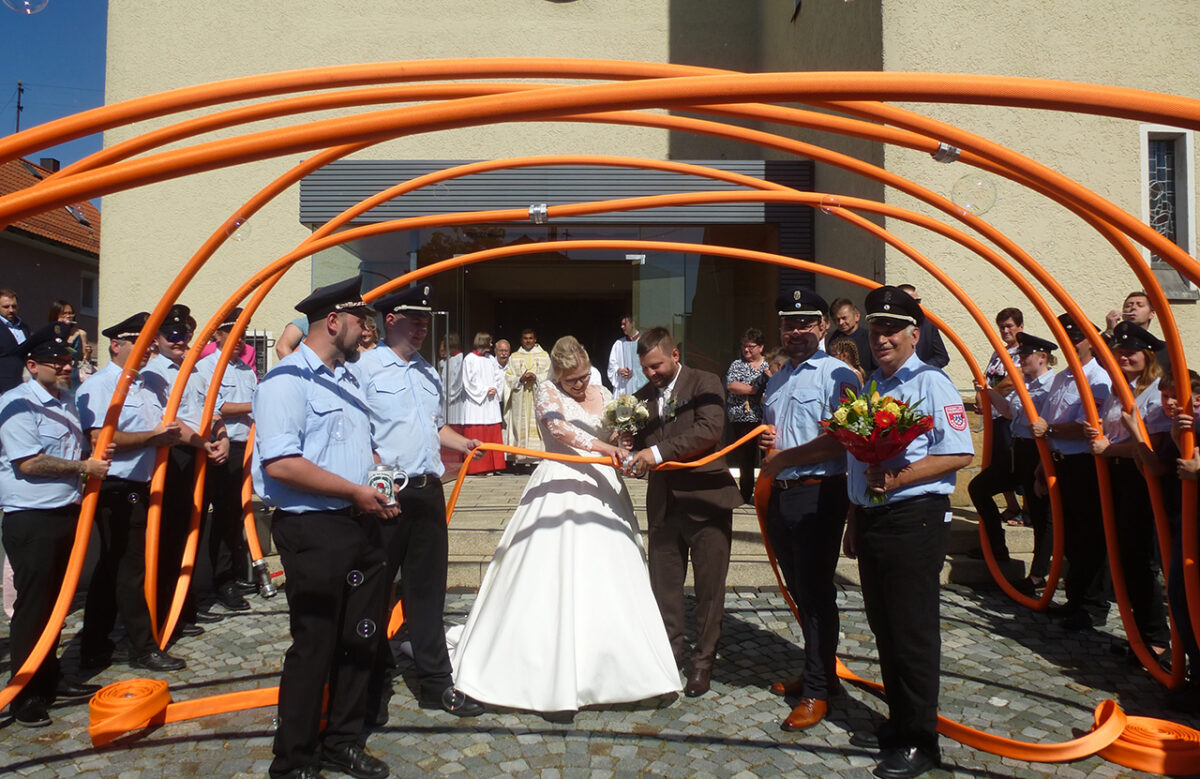 Nach dem Auszug in glühender Mittagssonne geniest das Brautpaar im Schlauchtunnel erst mal einen erfrischenden Schluck aus dem Feuerwehrkrug. Vorsitzender Johannes Aigner, die Kommandanten Christoph Wagner und Lukas Reger sowie Ehrenkommandant Hans Rodler wünschen viel Glück. Dem schließen sich Julian Kraus und Nicole Presche für CSU/JU, „Posthorn“-Chefin Franziska Liedl mit Service-Personal sowie Jagdvorsteher Bernd Heibl an.