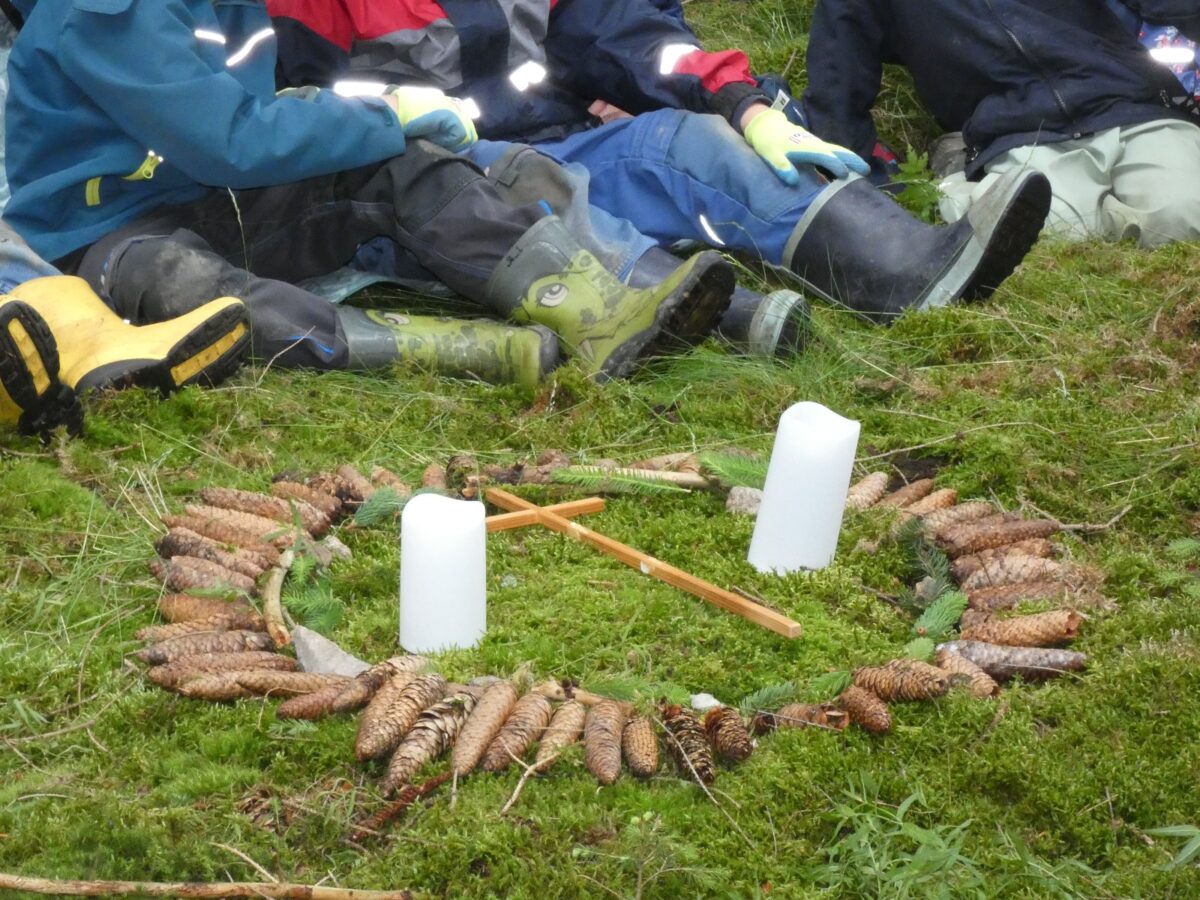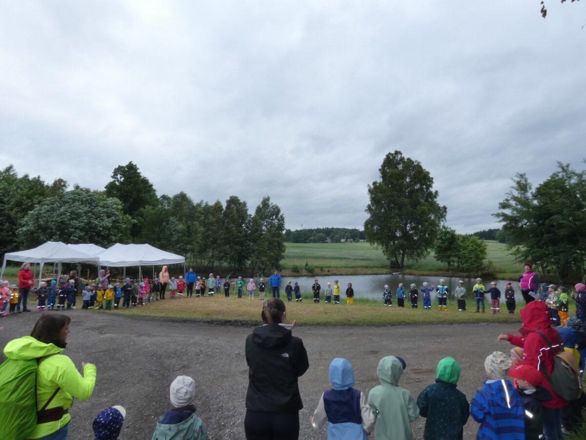 Die Waldwoche wurde vom Waldteam der KiTa mit Beate Gollwitzer an der Spitze bis ins Detail geplant und umgesetzt. Hier ließen sich die Kinder und das Personal auch von Regen, Wind und kühleren Temperaturen nicht aufhalten. Täglich starteten die Waldkinder mit einem Morgenkreis am Weiher, in dem sie sich begrüßten und Gott für die Welt dankten – hier waren auch die Frösche, die die Kinder die ganze Woche begleiteten, mit ihrem Quaken lautstark dabei.