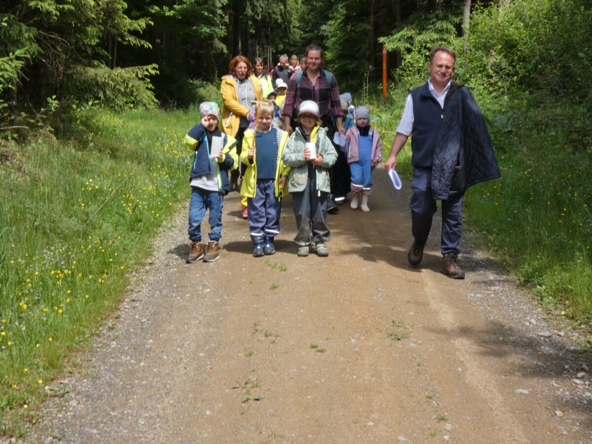 Natürlich durfte auch ein Waldmärchen nicht fehlen. Mithilfe des Kamishibais durften die Kinder spannend dem Märchen Hänsel und Gretel lauschen. Zum Abschluss der Waldwoche kam Pfarrer Alexander Hösl in den Wald, um zu sehen und zu hören, was die Kinder alles erlebt und gelernt haben. Gemeinsam mit ihm machten sich die Kinder auf den Weg zum Bittgang. Ausgestattet mit einem Kreuz und Kerzen gingen alle gemeinsam durch den Wald und besuchten die vier Stationen (Altäre) – an jedem wurde kurz verweilt und Gott gedankt für alles, was im Wald und auf der Erde lebt und ist.