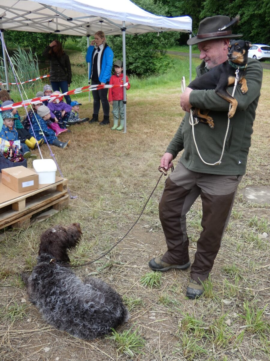 Ein besonderes Highlight war der Besuch des Jägers Konrad Ram. Er ist mit seinen Jagdhunden in den Wald gekommen und die Kinder lauschten sehr interessiert, als der Jäger von seinen Aufgaben im Wald erzählte und den Kindern erklärte, was zu tun ist, wenn sie Tiere im Wald finden. Er zeigt auch, welche Dinge gar nichts im Wald zu suchen haben. Richtig spannende wurde es, als er seine beiden Jagdhunde apportieren ließ und die danach gleich noch in den Weiher sprangen.