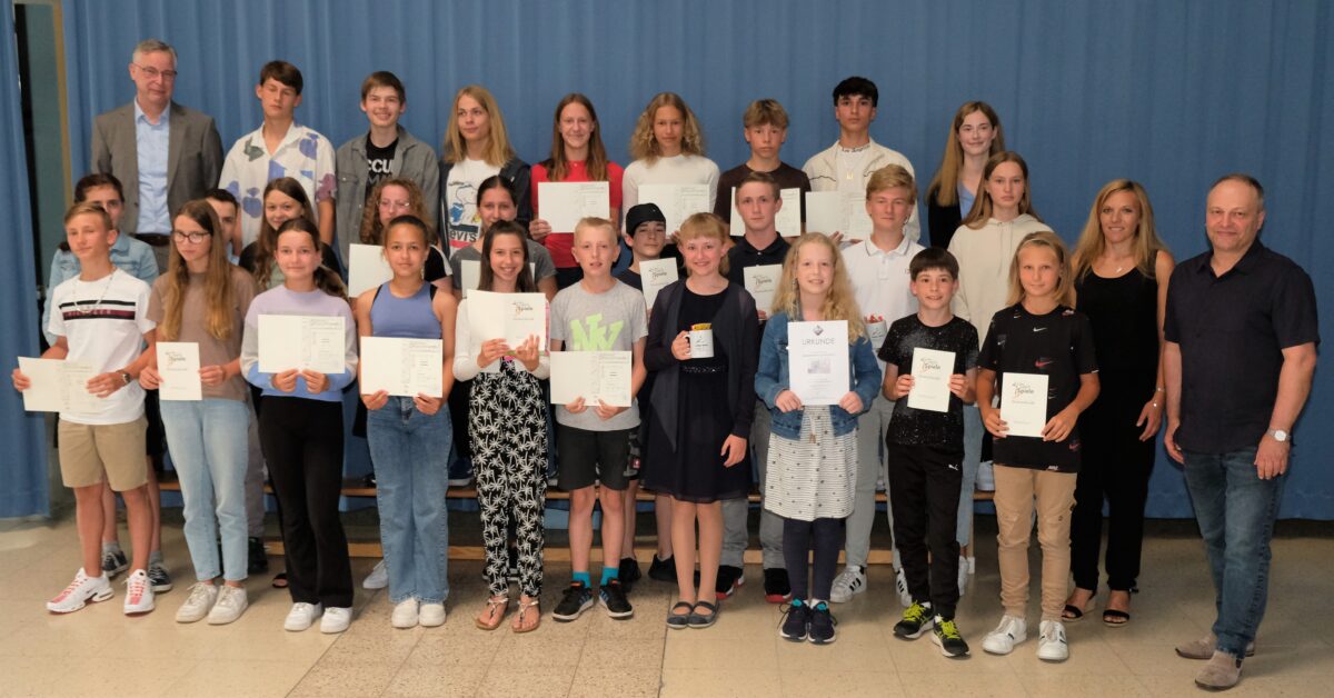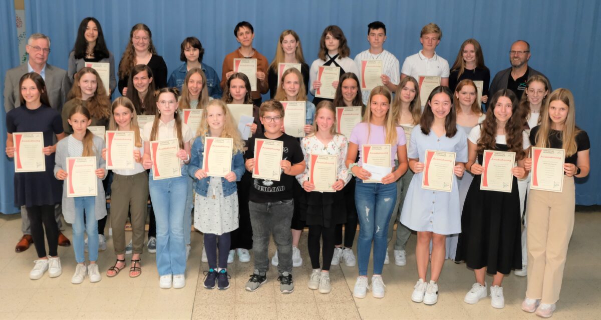 Impulsgeber dieses Schulschatzes standen kurz vor den großen Ferien im Mittelpunkt einer besonderen Würdigung. Jeweils die fünf besten Schülerinnen und Schüler einer Jahrgangsstufe erhielten von der Schulleitung eine besondere Anerkennung in Form von Urkunden und kleinen Geschenken. Ein Jubeltag auch für Eltern und Pädagogen. Sie alle feierten „Vorbilder, denen es gelang, selbstgewählte hohe Messlatten zu überspringen“, so der Schulleiter.