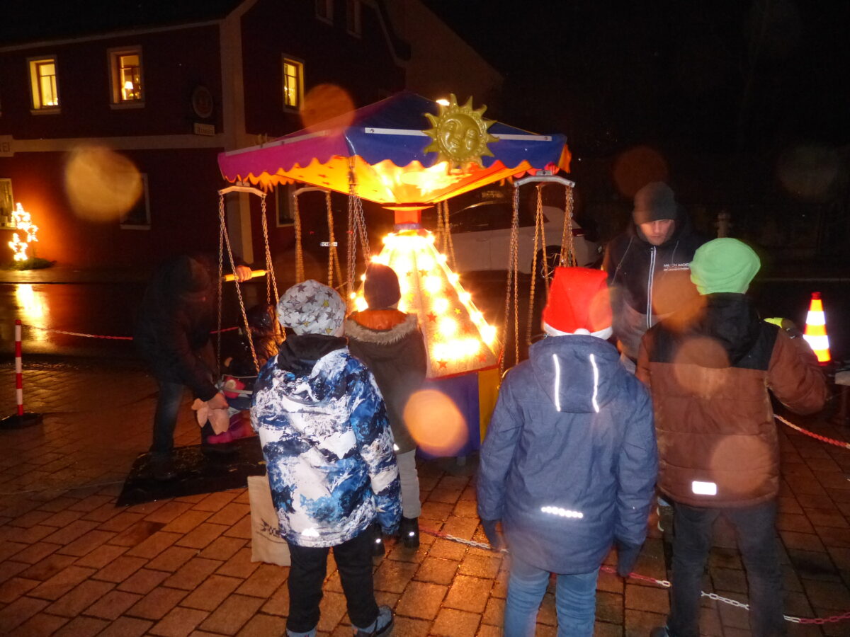 Als man am Samstag einen Blick nach oben wagte, war die Hoffnung noch groß, dass der Regen ausbleibt. Trost für die Veranstalter war wenigstens, dass der Wind ausblieb. Dem Weihnachtsmarkt ging ein Gottesdienst voraus. Mit einbrechender Dunkelheit füllte sich der Rathausplatz immer mehr mit Besuchern. Ein Anziehungspunkt ist dabei jedes Jahr die Tombola.