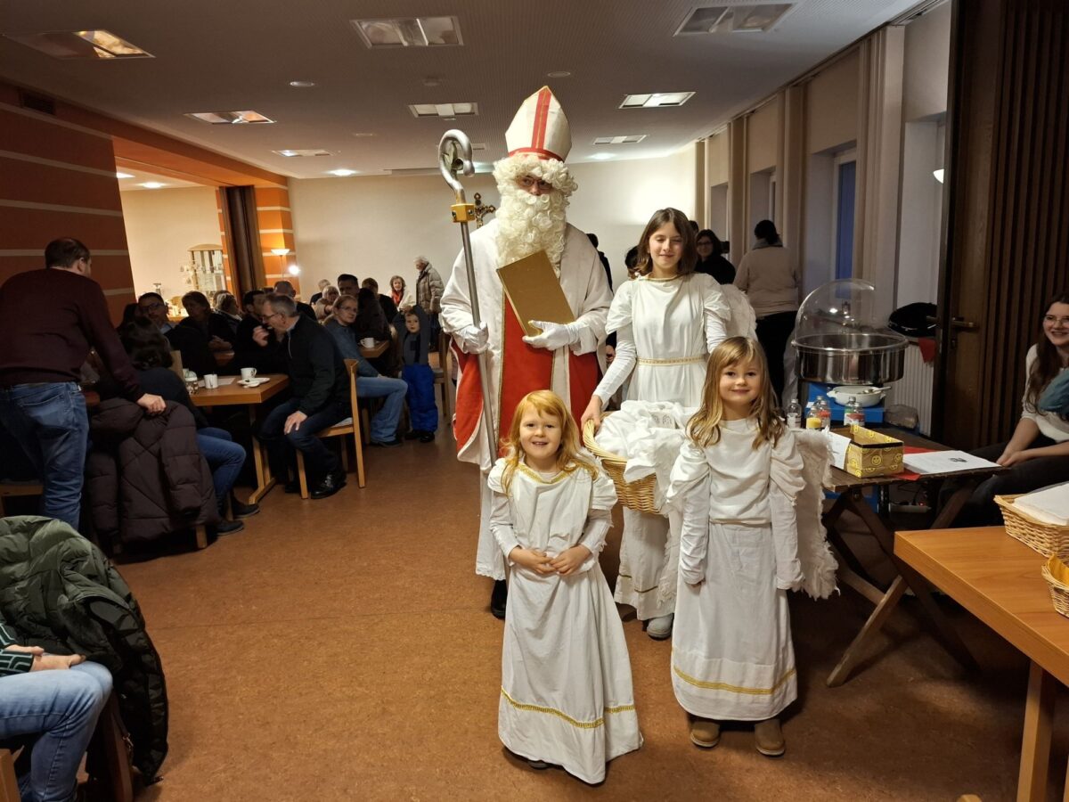 Ein Höhepunkt des Nachmittags war das Erscheinen des Nikolaus, dargestellt von Daniel Biermeier, begleitet von seinen Engeln Johanna, Andrea und Sabrina. Er erzählte den staunenden Kindern die humorvolle Geschichte einer außergewöhnlichen Weihnachtskrippe – samt angebranntem Christkindl, einem Asterix als Ersatzfigur und tierischer Unterstützung durch Nilpferd und Brontosaurier. Auch „Batman“ musste in der Fantasie eines Jungen für eine beschädigte Figur der Heiligen Drei Könige einspringen.